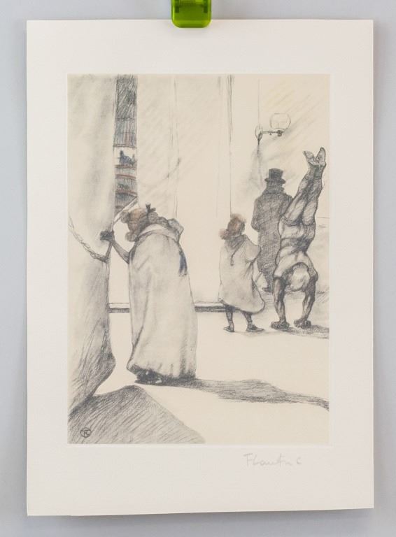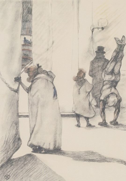 Lithograph on paper. Featuring a figure in a white cloak looking back and a person walking on their hands. Signed "T-Lautrec" to the bottom right. Plate size: 22 x 15.5 cm (8.5 x 6 inches). Sheet size: 29.5 x 20.5 cm (11.5 x 8 inches).