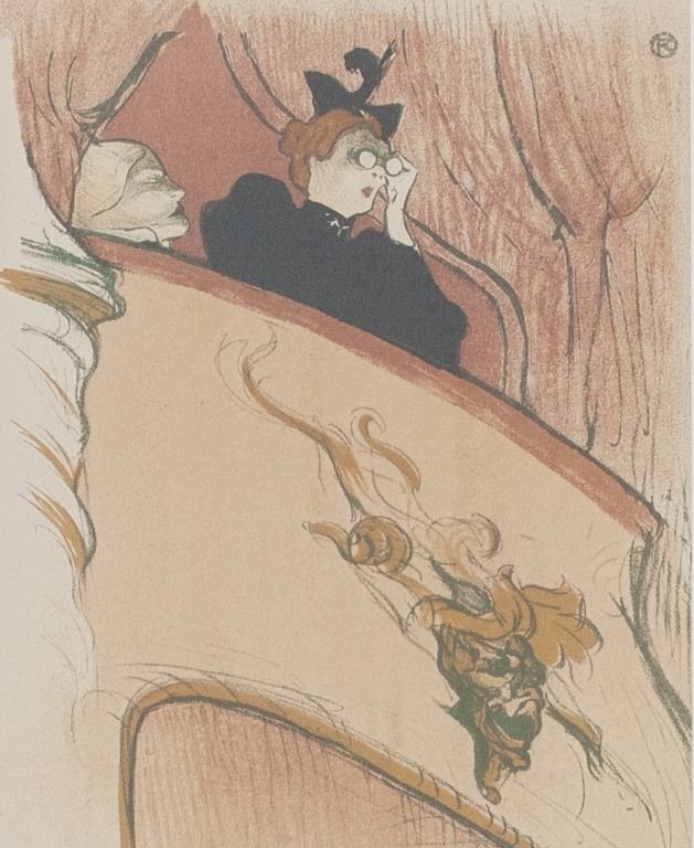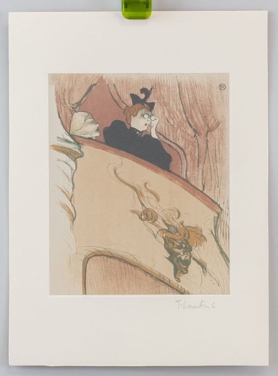 Lithograph on paper. Featuring a woman watching opera from a box. She's peering down with opera glasses held to her eyes. Signed "T-Lautrec" to the bottom right corner. Plate size: 17.5 x 14.5 cm (7 x 5.5 inches). Sheet size: 28 x 21 cm (11 x 8 inches).