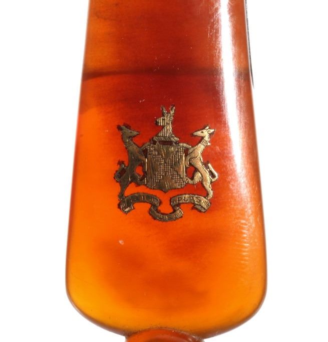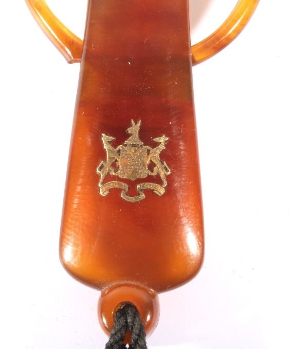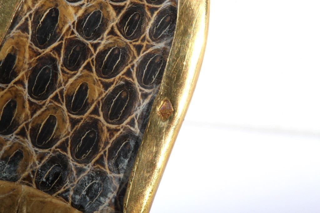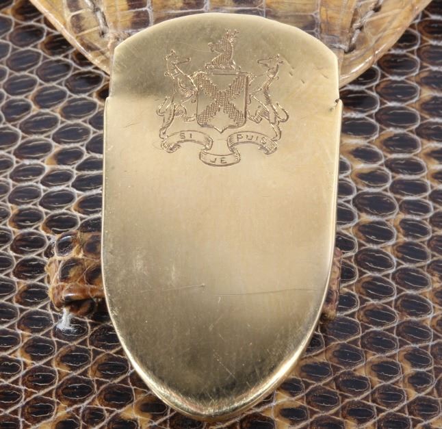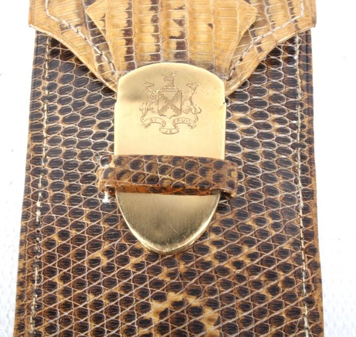 This lot features a Unique 18k Gold, Tortoise Shell & Lizard Skin Case Lorgnette. The piece shows an early antique age most likely being from the 19th Century or earlier. The case and lorgnette are marked in gold of the coat of arms of the clan of Colquhoun. The case looks to be made of lizard skin and the lorgnette are made of tortoise shell. The gold is French hallmarked with a eagle head for 18k gold. The piece is in good condition, with a small chip on the glass frame. The glasses have not been tested or confirmed as Tortoise shell, these could be authentic tortious shell of an antique age or imitation shell. The case measures 6 1/2" long, and 1 3/4" wide.