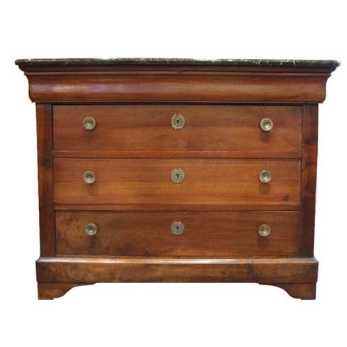 Gorgeous French Louis-Philippe period chest of drawers in solid walnut with lost-wax bronzes and a beautiful veined black marble top.</em></td>