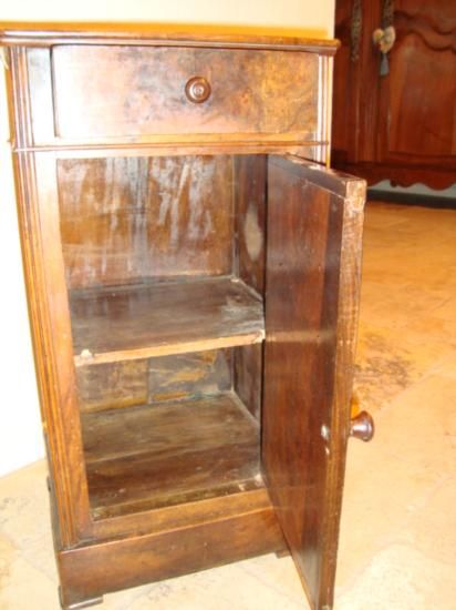 Very nice French Louis Philippe period side table nightstand with one drawer, made of solid walnut wood and burled walnut in the 1840's by a cabinet maker from Southwestern France. Very good condition! We ship from Texas (not from France)! h-28"/ w-14.75"/ d-13"