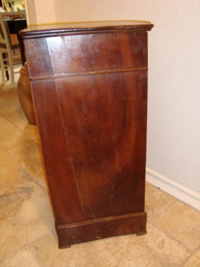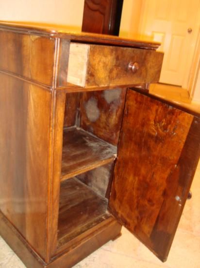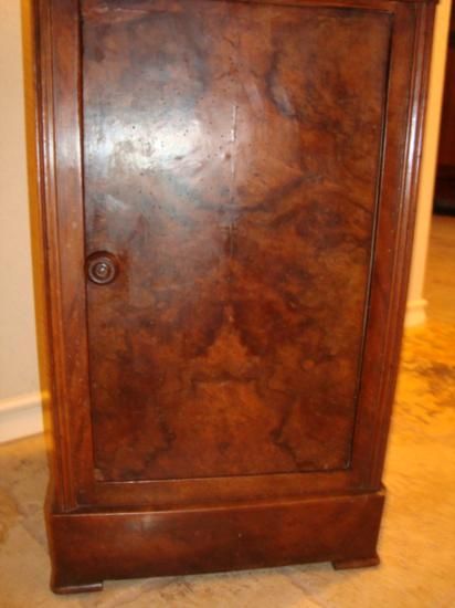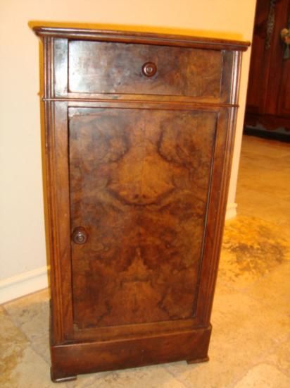 Very nice French Louis Philippe period side table nightstand with one drawer, made of solid walnut wood and burled walnut in the 1840's by a cabinet maker from Southwestern France. Very good condition! We ship from Texas (not from France)! h-28"/ w-14.75"/ d-13"