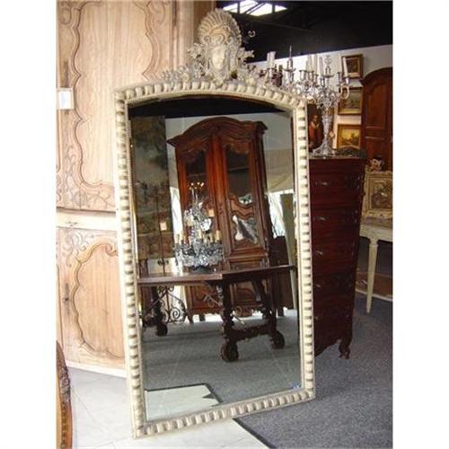 The frame is painted in a pale grey/green and has highlights of pale gold paint. There is an espagnolette centered on the top molding. Crowning her head is a ruff painted in muted gold, while a drapery sway ends in leaves beneath her chin. From her hair, are flowing garlands of fruit and trailing foliage. The gadrooned egg and acanthus leaf decoration is bordered on the interior by beading. A newer, beveled glass mirror was added at some point in its history. This is a stunningly simplistic piece, suitable for formal or country decor.