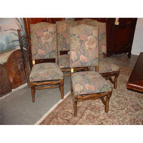 This is a group of 6 Louis XIV style mutton bone chairs from France. Each chair has a machine made floral tapestry with deep forest greens, salmons, and touches of pale blue. This is attached by brass nailheads. The stretchers are in the H design and the feet are "mutton bone" of the Louis XIV style.