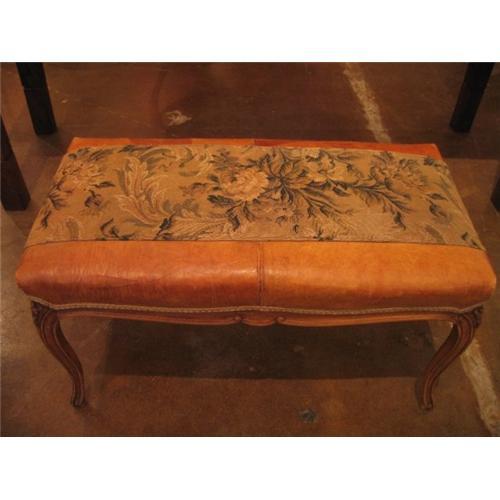 French Louis XV style solid hand-carved fruit wood bench. Covered in vintage leather and a 19th-century tapestry fragment. From Provence, c. 1900.