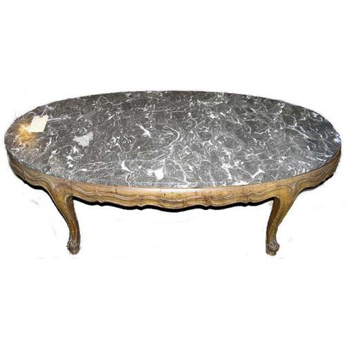 This old oval coffee table with black marble top measures 49" long, 25" wide and 16" high. Dates from the early to mid 20th century. In the French Louis XV or XVI style with four cabriole legs ending in scrolled feet, and a scalloped skirt with carved design. This item resides on the upper west side of Manhattan ( New York city ) and may be seen by appointment.