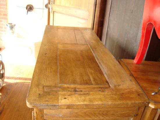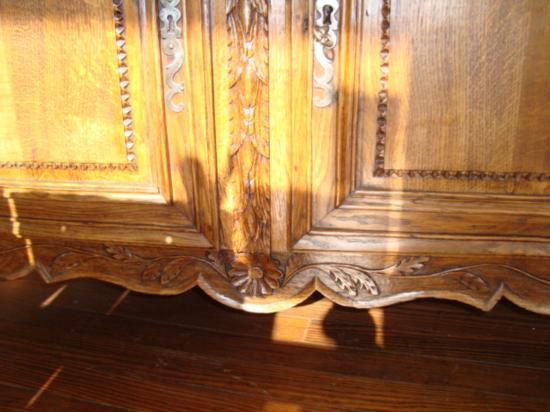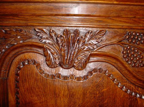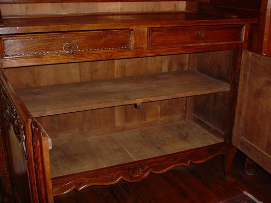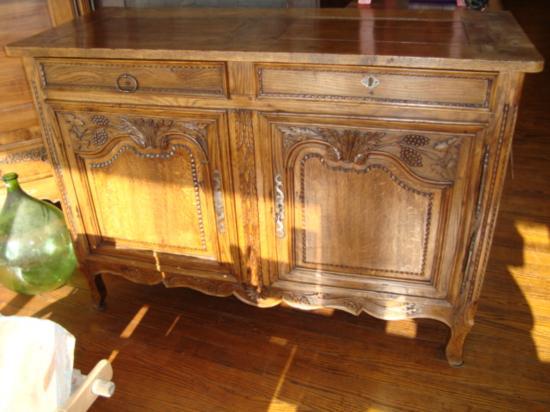 Here is an absolutely wonderful Louis XV Provincial buffet (sideboard) from Normandy , France , made in the very early 1800's with solid French oak. This French buffet is a wedding piece (very valuable). We recognize the wedding antiques by this hand carved pieces with flowers and bunch of grapes. This piece was order by a father when his daughter was born...for her wedding gift (In France , it was usual, at this time). Don't worry for the shipping...we ship from Texas (not from France). h-59.5/ w-55.75/ d-22.5