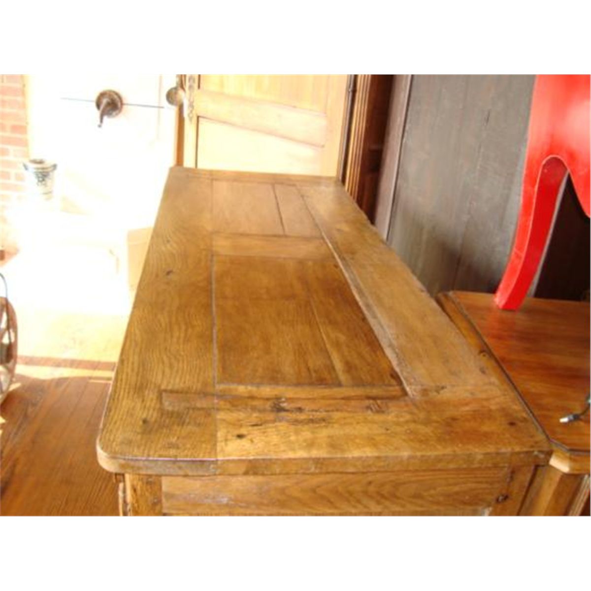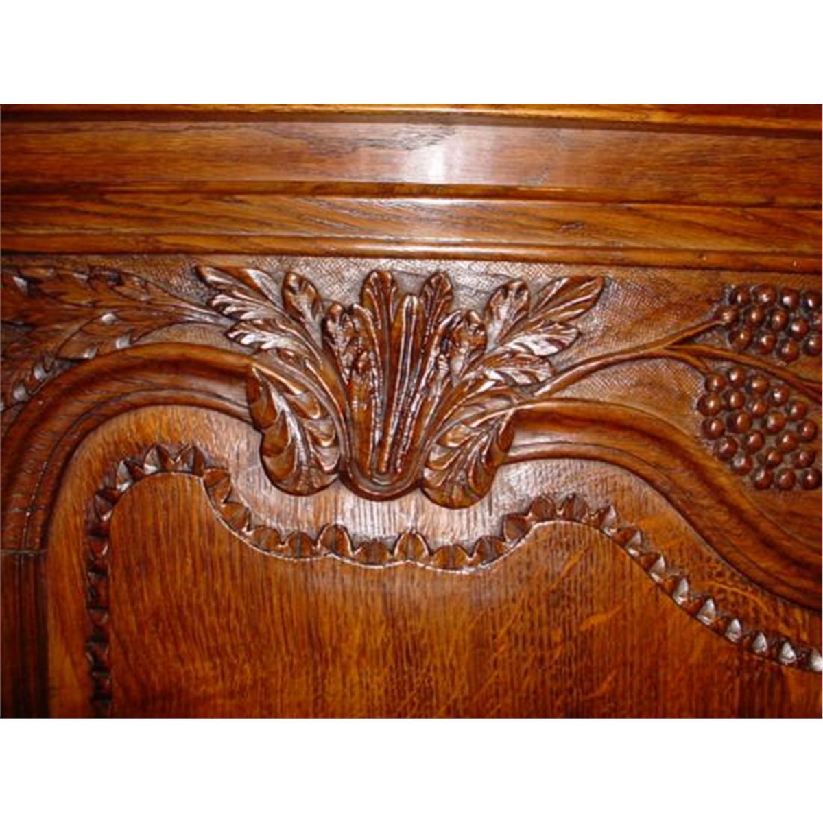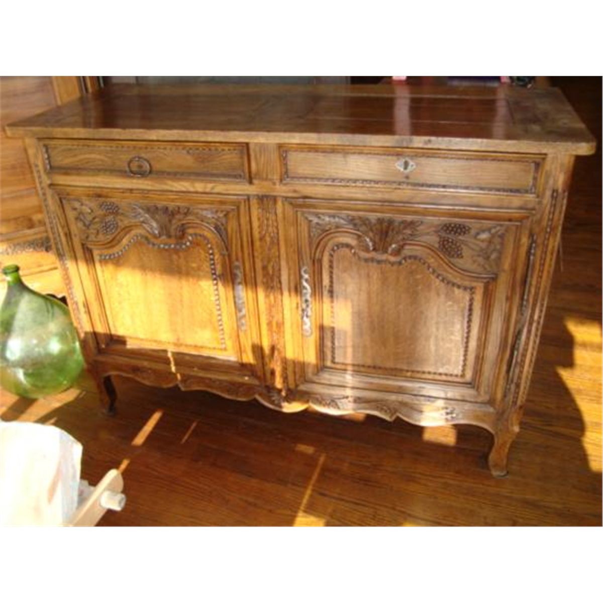 Here is an absolutely wonderful Louis XV Provincial buffet (sideboard) from Normandy, France, made in the very early 1800's with solid French oak. This French buffet is a wedding piece (very valuable). We recognize the wedding antiques by this hand carved pieces with flowers and bunch of grapes. This piece was order by a father when his daughter was born...for her wedding gift (In France, it was usual, at this time). Don't worry for the shipping...we ship from Texas (not from France).h-59.5/ w-55.75/ d-22.5