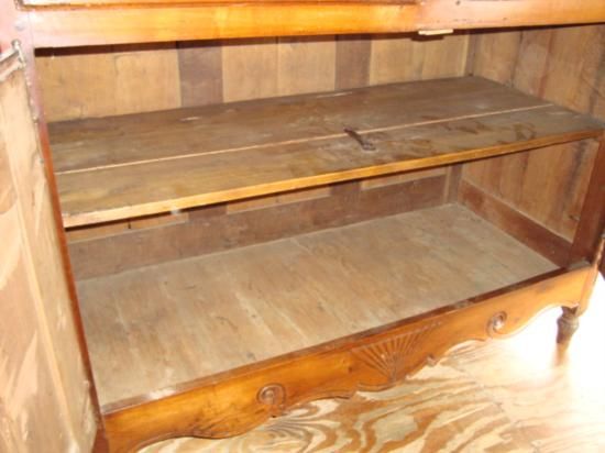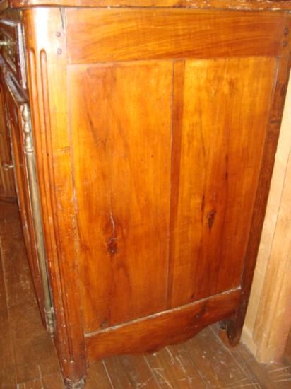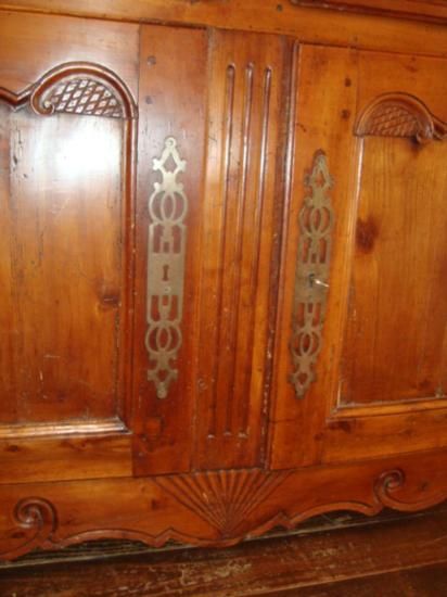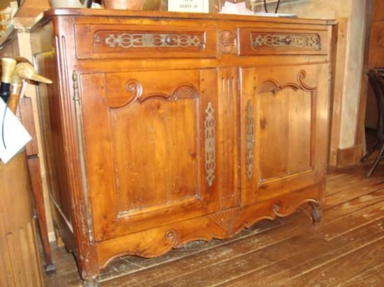 Here is a wonderful Louis XV Style French Provincial Carved Buffet Sideboard, late 1700's. The rounded corner top over two frieze drawers, above double paneled cupboards with steel fiche hinges and escutcheons, on turned legs. H.- 39 3/4 in., W.- 50 1/2 in., D.- 22 1/2 in. This Country French sideboard (Buffet) was made by a French cabinet maker from Southwestern France (Bordeaux region). Let this charming piece touch your life. It will be a wonderful conversation piece. It will grace any room of your home with elegance. Condition: Very good for its age!!! The key is not the original one. We ship from Texas (not from France).