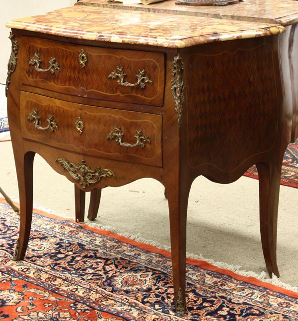 (lot of 2) French Louis XV style secretarie commodes circa 1890, each having a serpentine marble top above the conforming inlaid kingwood case, the top fall front drawer revealing the fitted interior and embossed leather writing surface, and rising on gilt metal mounted cabriole legs, 35.5''h x 36''w x 19''d (key in office) Provenance: Estate of Mr. and Mrs. Ben H. Eaton, San Francisco, CA