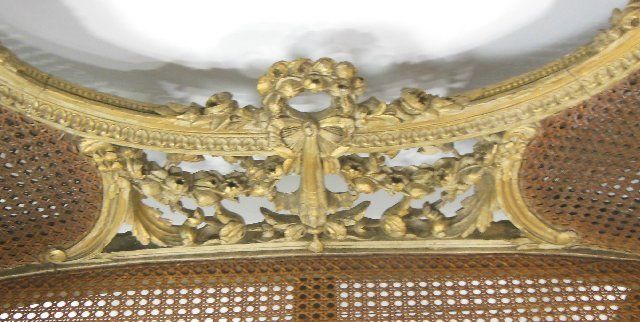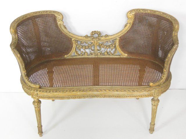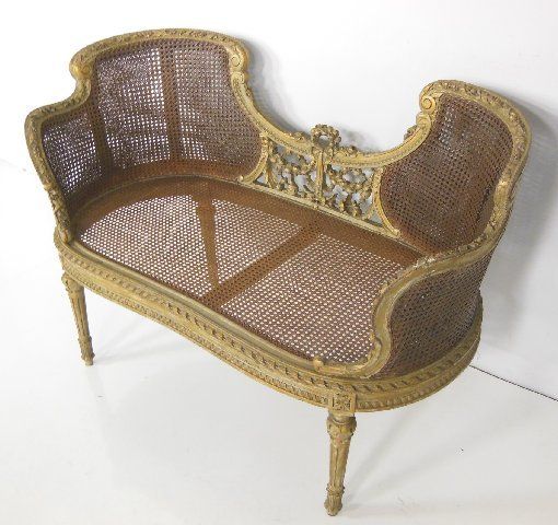 Losses to cane, gilt wood, heavily carved, double cane back, green seat. Aprox. 37" W x 19" D (seat), 44"W x 20.5" D x 29.5" H "(back).