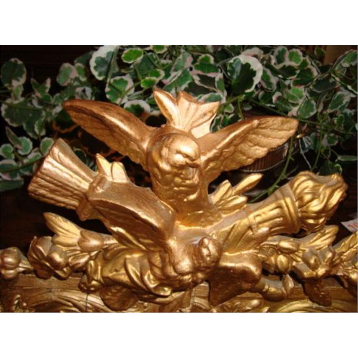Very valuable French Louis XVI Style Gilt and Gesso Over Mantel Mirror, circa 1870 with a central crest of birds, a torch and quiver and flowers, on a wide floral relief decorated frame. The frame was made of wood and plaster. Old little cracks but it is nothing for its age! H.- 47 3/4 in., W.- 31 in., D.- 2 in. We ship from Texas (not from France)!