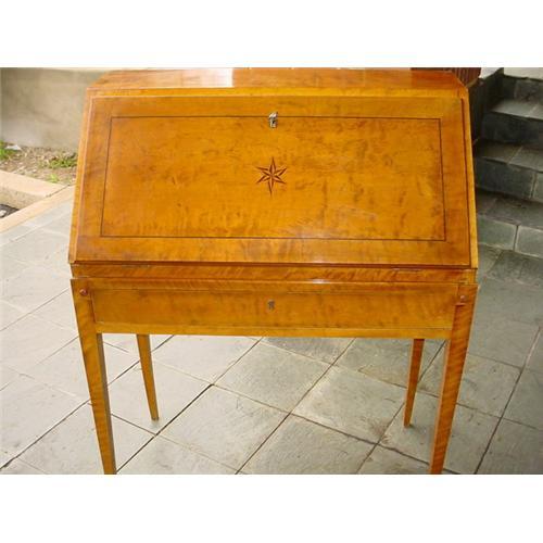 This piece is a veneered fruitwood desk (Bureau de pente) and was made with burled maple and pear wood. Great inlays!