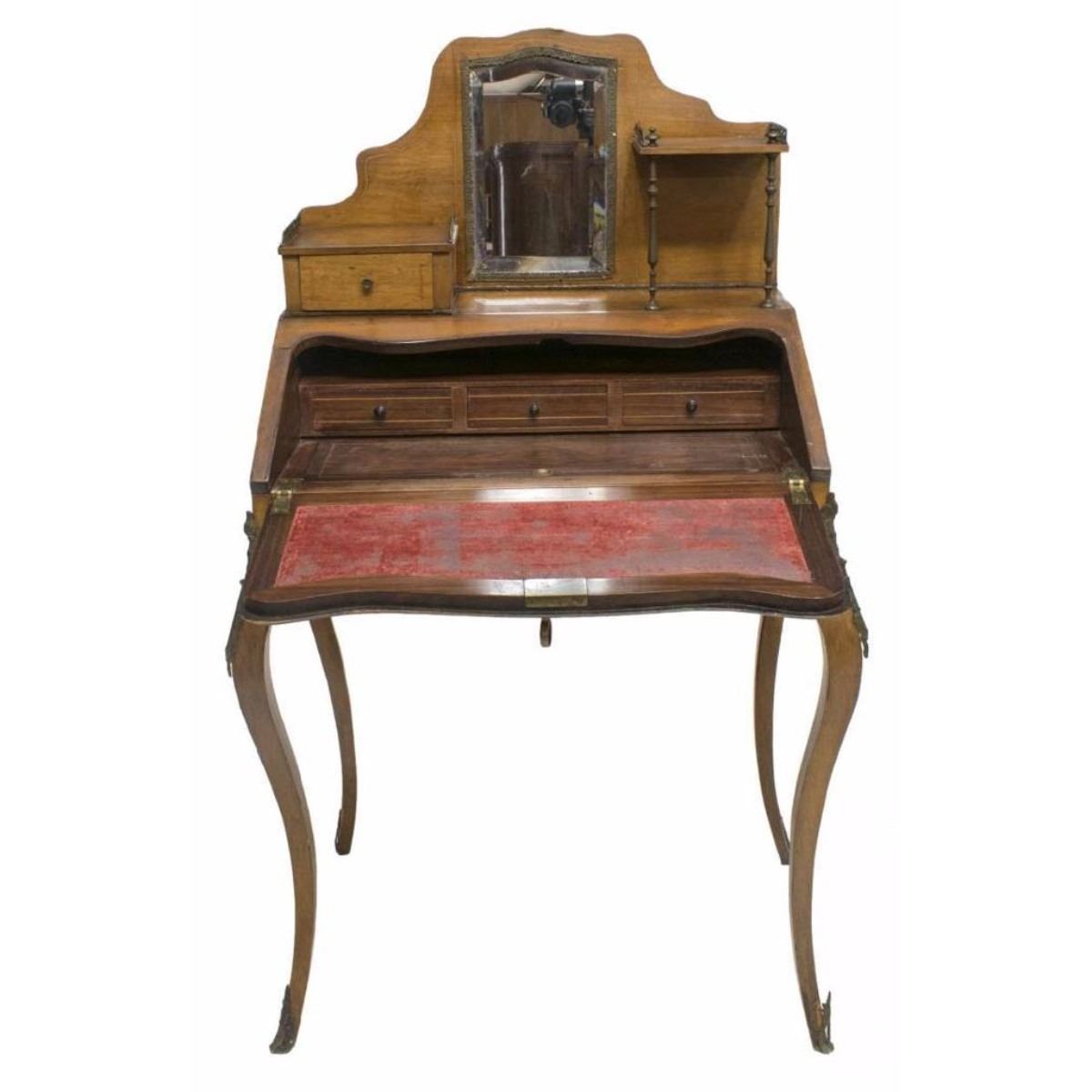 French Louis XV style secretary, 20th c., upper part with beveled mirror, drawer, and stand, all over drop front panel with floral marquetry, opening to velvet writing surface, interior fitted with three drawers and sliding compartment, all rising on cabriole legs with cast metal mounts and feet caps, approx 50"h, 30.75"w, 19"d