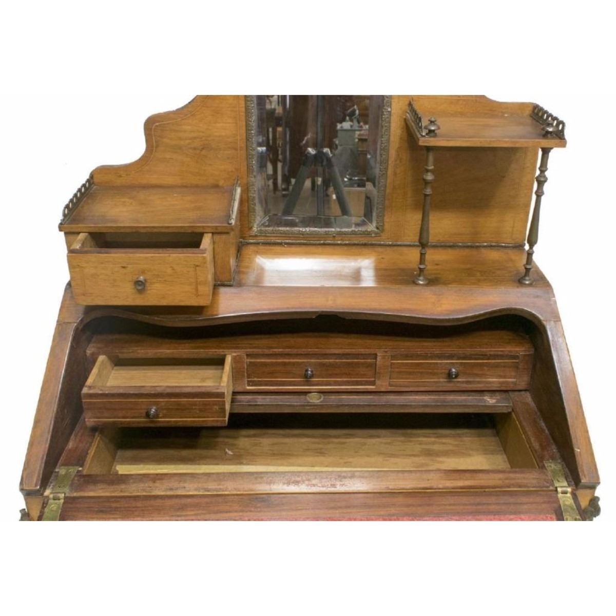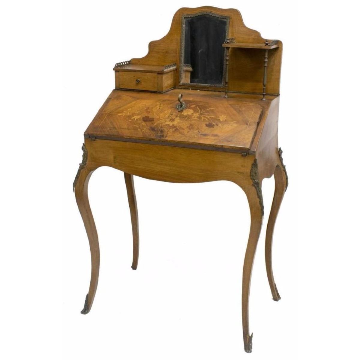 French Louis XV style secretary, 20th c., upper part with beveled mirror, drawer, and stand, all over drop front panel with floral marquetry, opening to velvet writing surface, interior fitted with three drawers and sliding compartment, all rising on cabriole legs with cast metal mounts and feet caps, approx 50"h, 30.75"w, 19"d