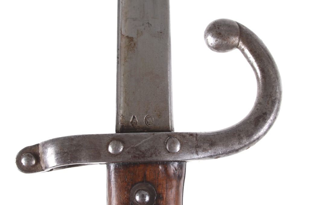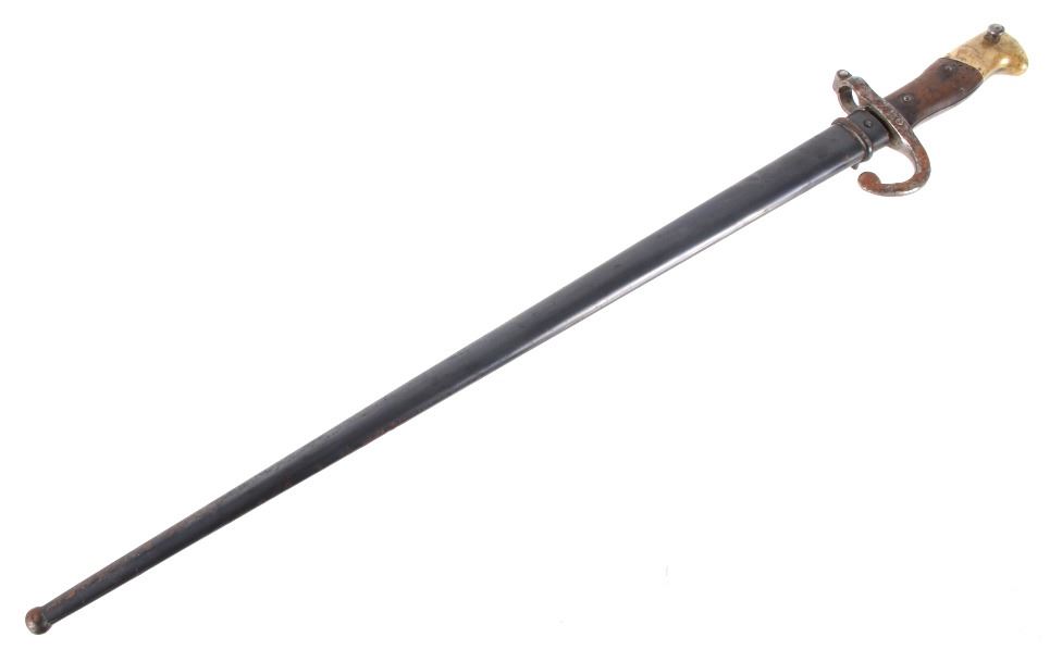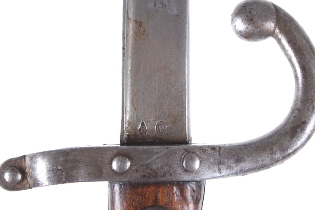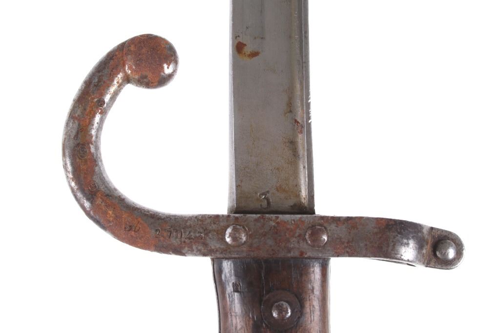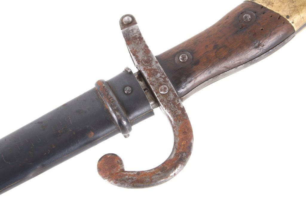 Featured in this lot is this French M1875 WWI sword bayonet w/ scabbard. The bayonet features a beautifully crafted steel and wooden handle construction that features a T-blade and is marked on the hilt 'e - R - U' with a serial number of '27043' with an 'E' on the blade and an 'S - M' on the other side of the blade. The top of the blade is marked: Mo re d'arsmes de Chat A Asout 1875. The condition of this bayonet is good with oxidation adorning the scabbard and shows patina and oxidation to the blade and hilt but otherwise shows good overall condition. The measurements of this sword bayonet in its sheath is 26" x 32 3/4" x 1 1/8" and the blade length is 20 1/2".