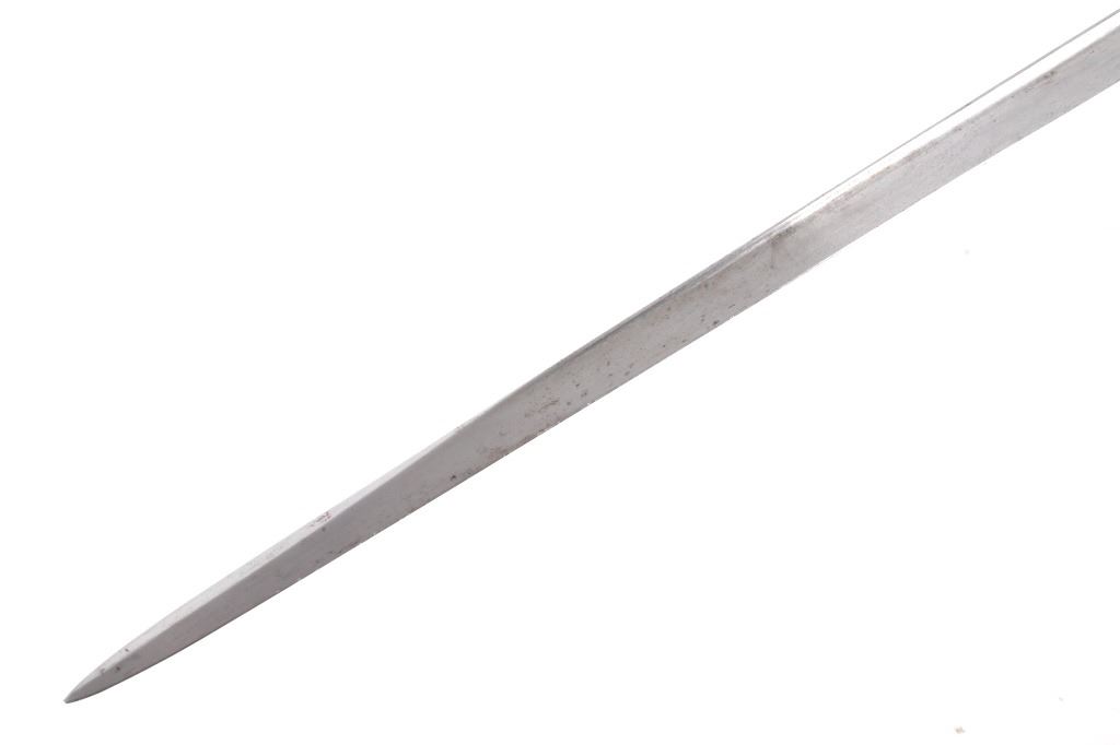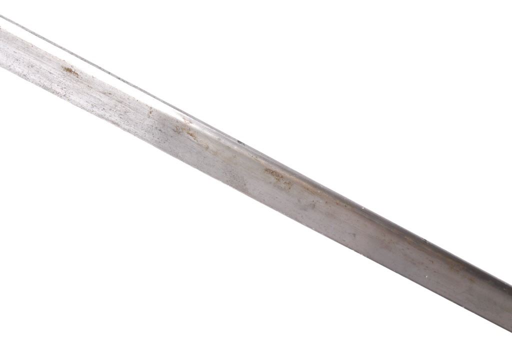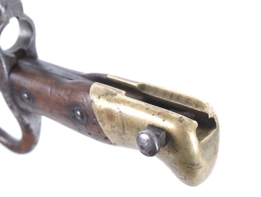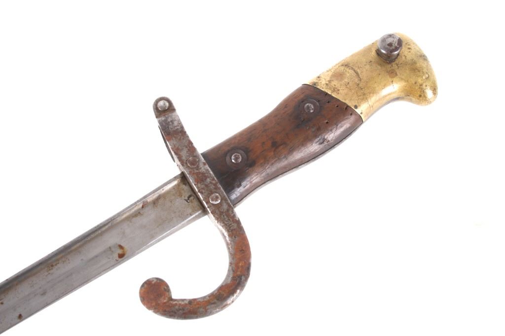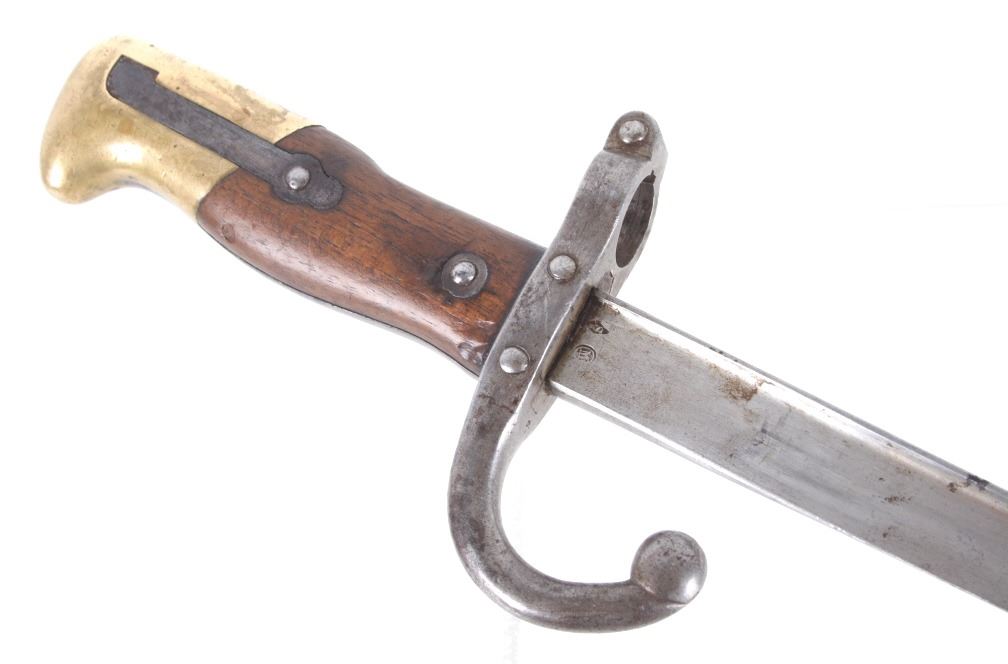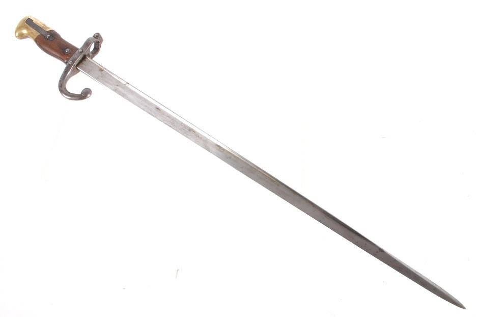 Featured in this lot is this French M1875 WWI sword bayonet w/ scabbard. The bayonet features a beautifully crafted steel and wooden handle construction that features a T-blade and is marked on the hilt 'e - R - U' with a serial number of '27043' with an 'E' on the blade and an 'S - M' on the other side of the blade. The top of the blade is marked: Mo re d'arsmes de Chat A Asout 1875. The condition of this bayonet is good with oxidation adorning the scabbard and shows patina and oxidation to the blade and hilt but otherwise shows good overall condition. The measurements of this sword bayonet in its sheath is 26" x 32 3/4" x 1 1/8" and the blade length is 20 1/2".