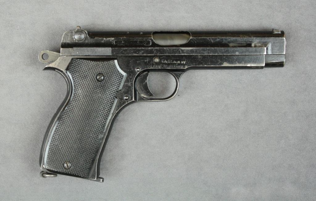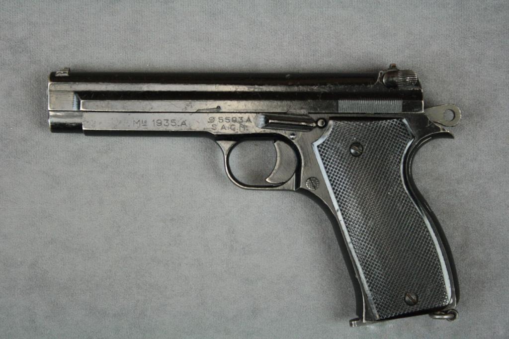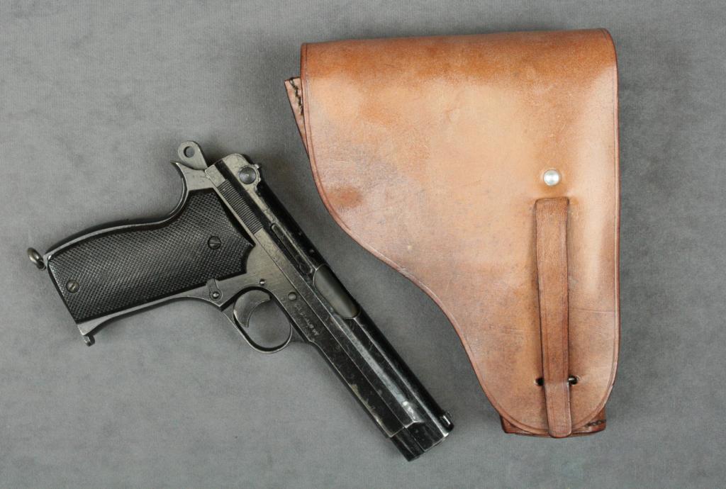 French MAB Model 1935 semi-auto pistol,  import marked, 7.65mm cal., 4-1/4” barrel,  black finish, checkered plastic grips with  woven lanyard and tan leather flap holster,  #D5593A. This gun is in overall goodcondition showing an old re-finish, action  needs work; one extra magazine.   Est.:    $100-$200.