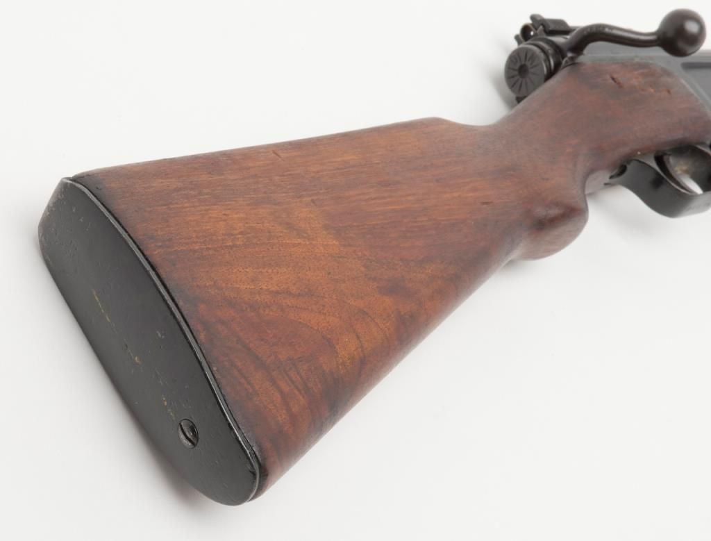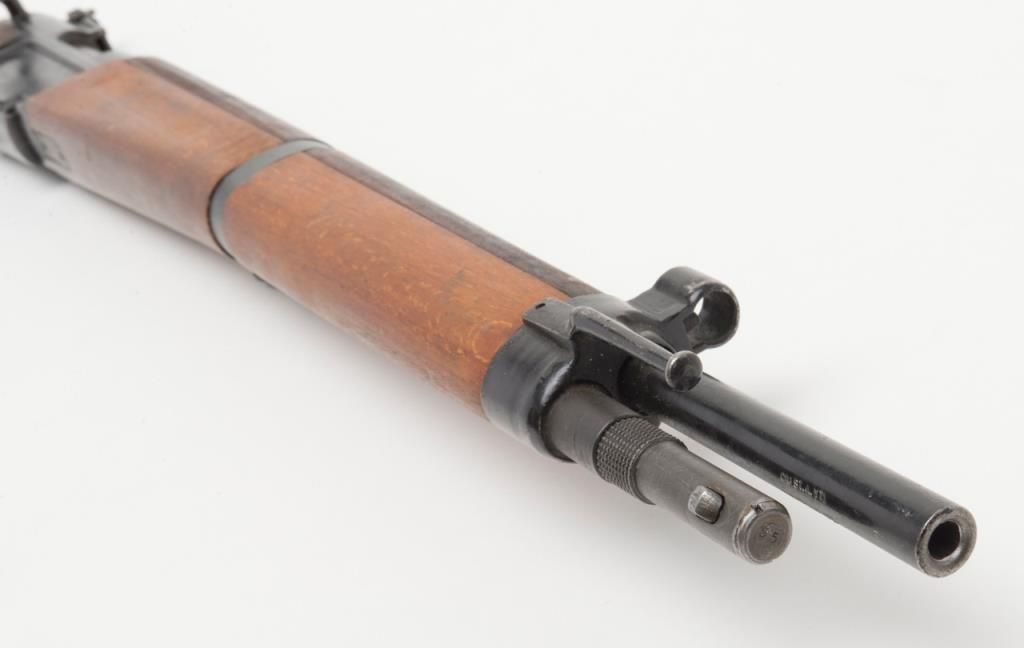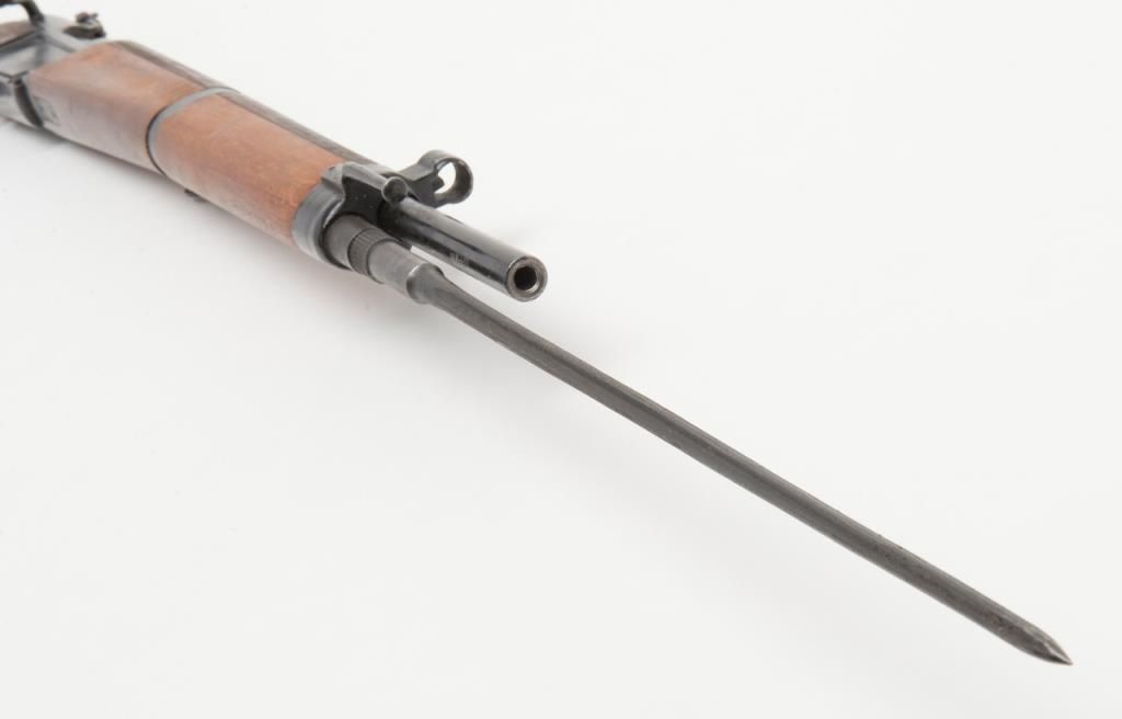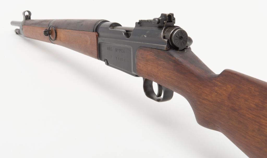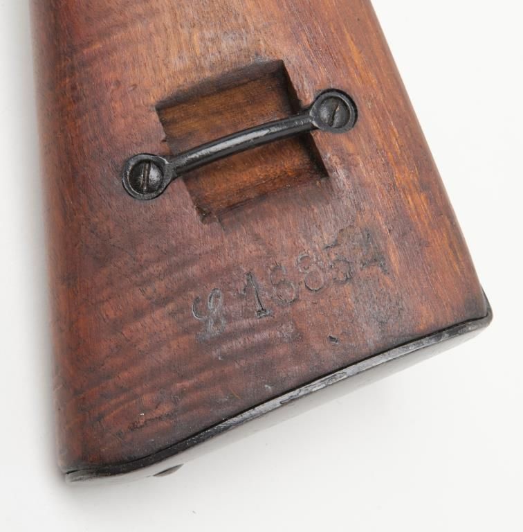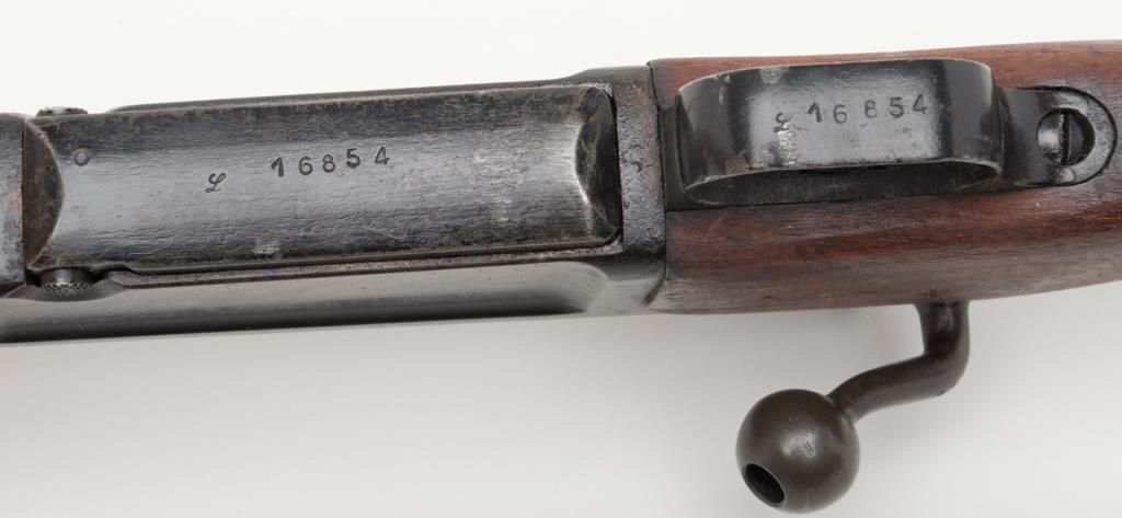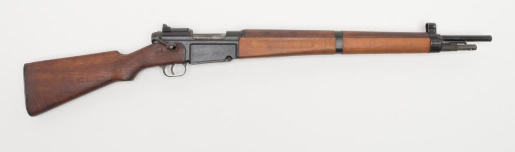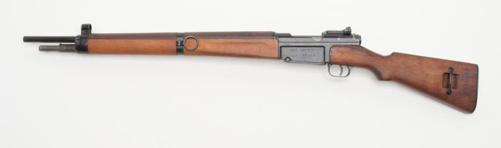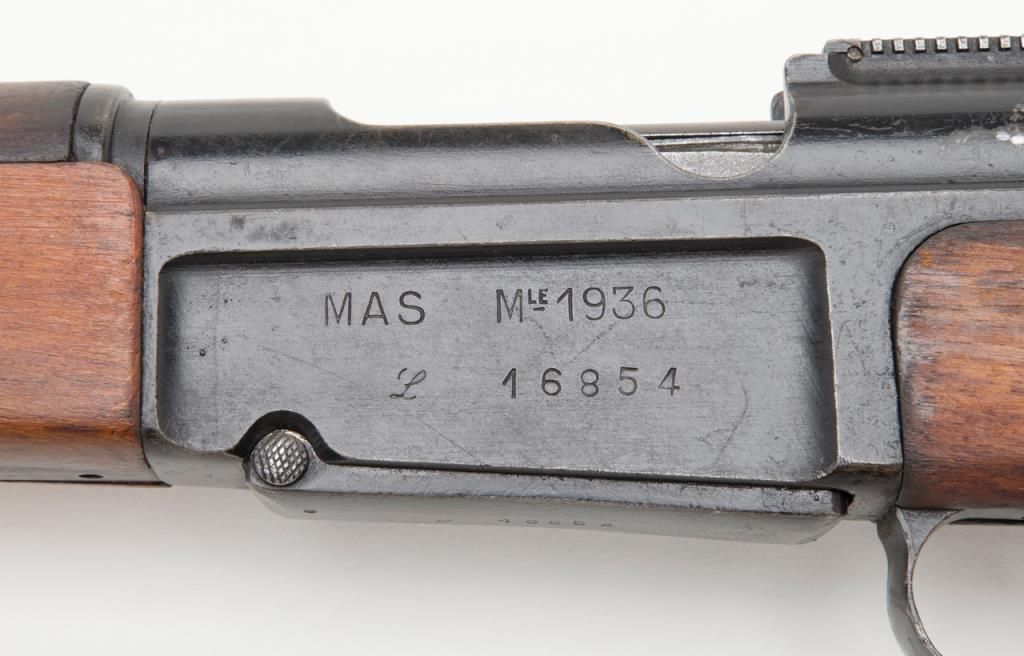 French MAS Model 1936 bolt action rifle, caliber 7.5 French, Serial #16854. The rifle is in overall very good condition with a 23” import marked barrel. The rifle retains the majority of its military finish with integral bayonet, slingmounts, tangent rear sight and metal butt plate. The smooth wood stocks are in very good condition with minimal marks consistent with storage and are serialized to the rifle. The bore is very good, action crisp and markings sharp on this lightlyused rifle. All visible serial numbers are matching including the butt stock. (C+R/PPT). Est.: $200-$400.