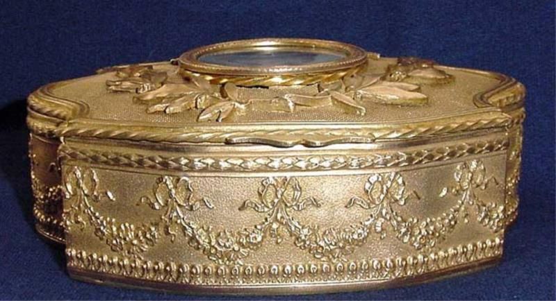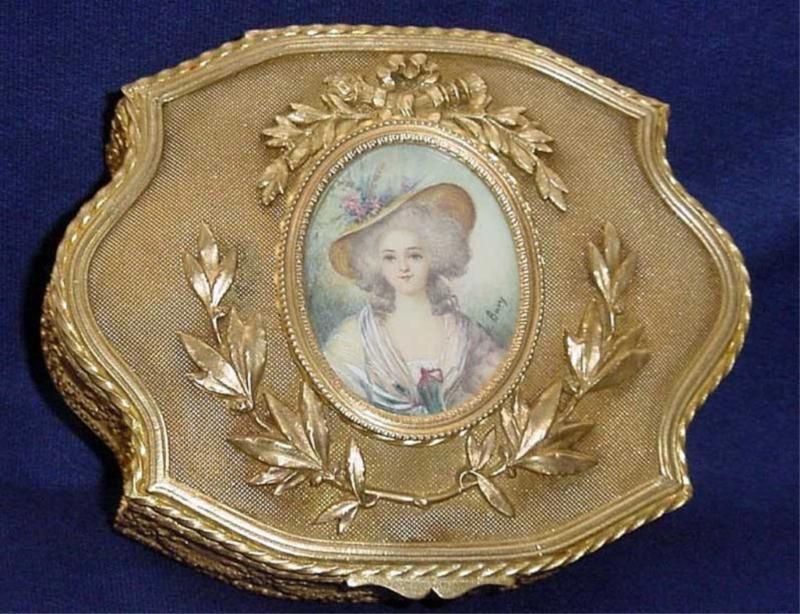 BRONZE PAINTING MINIATURE SIGNED JEWELRY BOX FRANCE 5" Antique gorgeous gilt / dore bronze jewelry casket box completely ornated with filigree mount. Painting miniature on top depicting the portrait of a beautiful young lady, it's protected with glas
