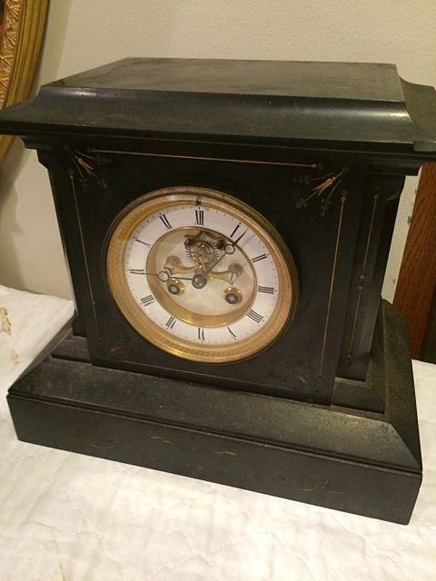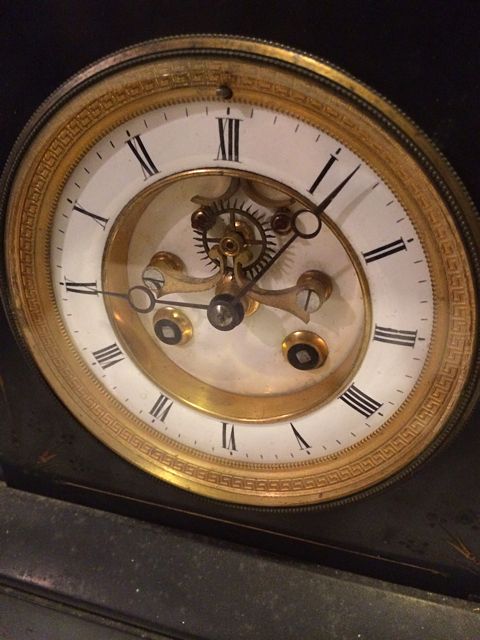 Very ornate with open escapement, French mantel clock. Very ornate gold inlay, gold incisings on front, all complete.