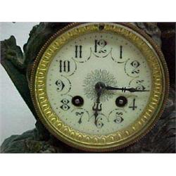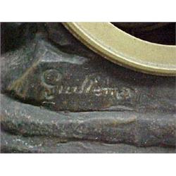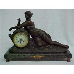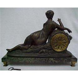 French figural mantle clock "Reveuse" with spelter female figure reclining on clock, artist signed on back (Guilleme) on beveled green marble base with gilt metal feet, 19" across x 14" h., minor loss to gilt ormolu on bottom front (with key)