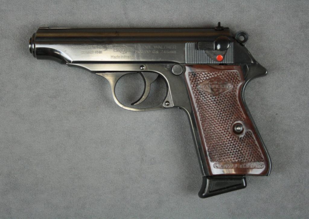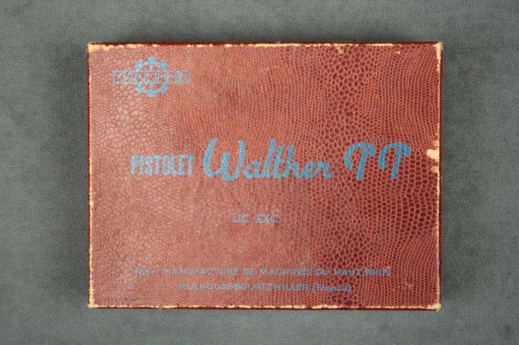 French Manurhin Walther licensed Model PP DA semi-auto pistol, 7.65mm cal., 3-3/4” barrel, black finish, Interarms imported, checkered mottled brown plastic grips, #307024 with one extra magazine, a box of ammo, cleaning kitand factory two piece cardboard box. This gun is in overall excellent condition showing the majority of its original finish, fine bore, action, markings and grips. Est.: $300-$600.