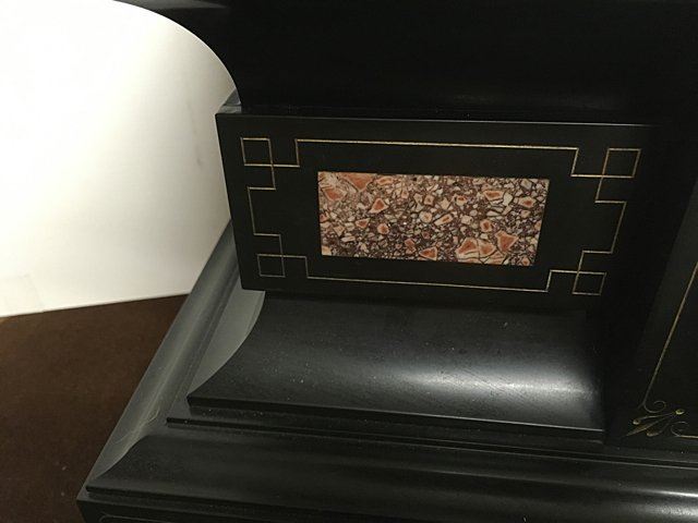 French Marble Mantel Clock with beautiful rose marble inlay, nice incising in Art Deco style, ornate gold gilt dial, apron and beatiful gold gilt claw feet. Has key and pendulum. Measures approx. 9" tall x 19" wide x 9" deep.