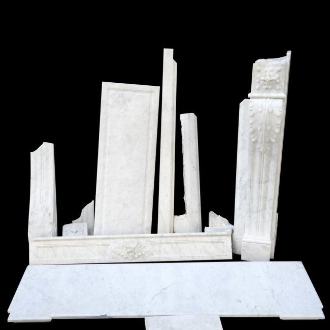 Carved and decorated white marble mantel. Purchased from Wm H. Jackson Company NYC. One section damaged.