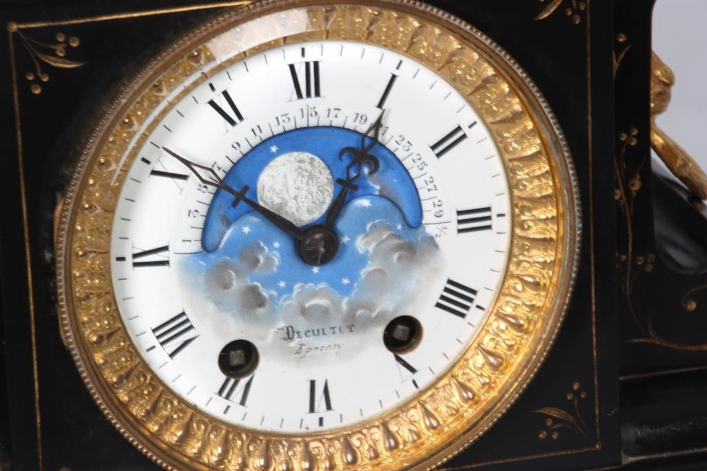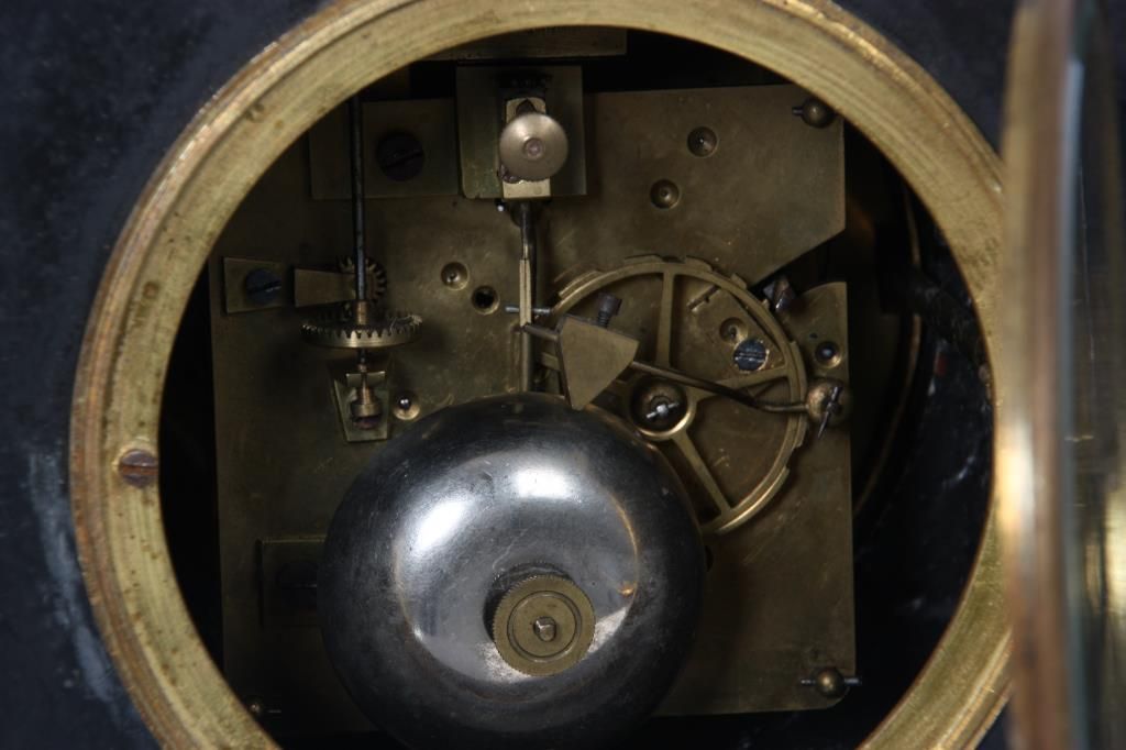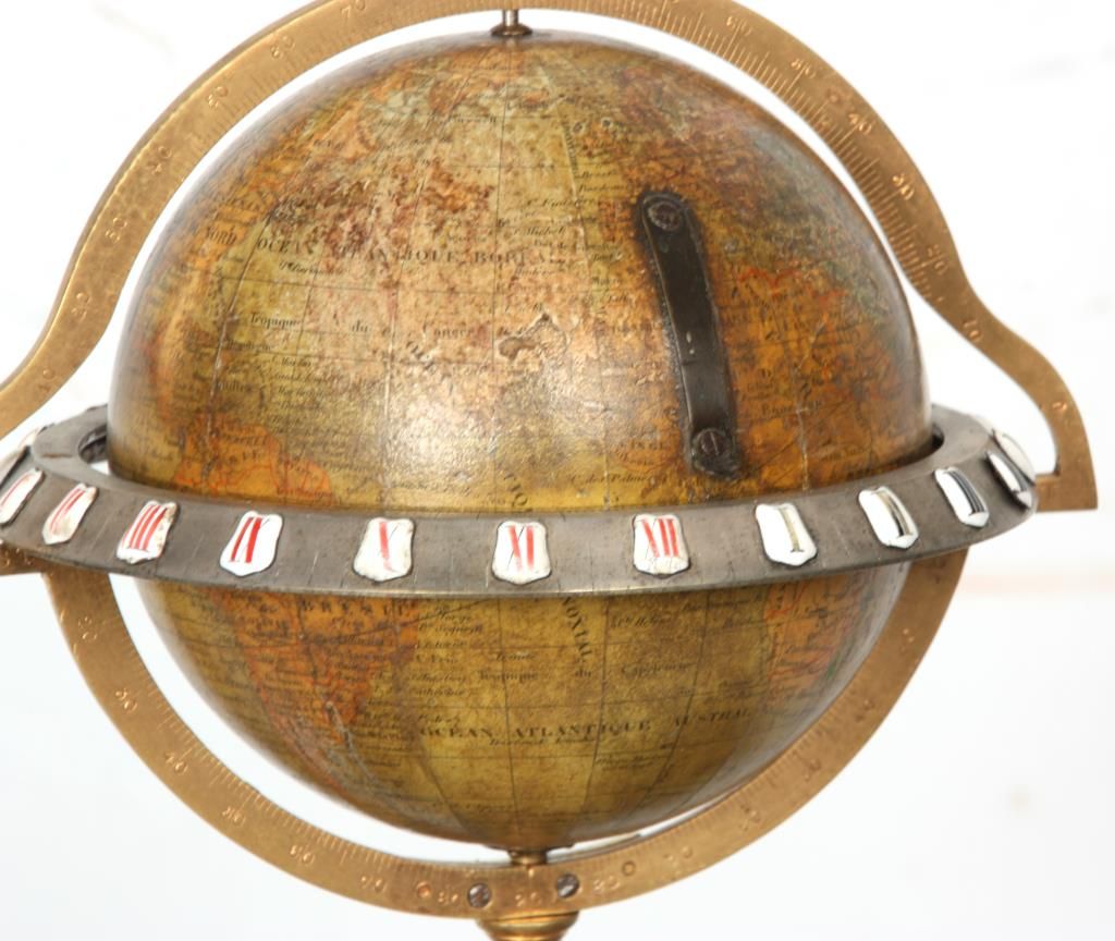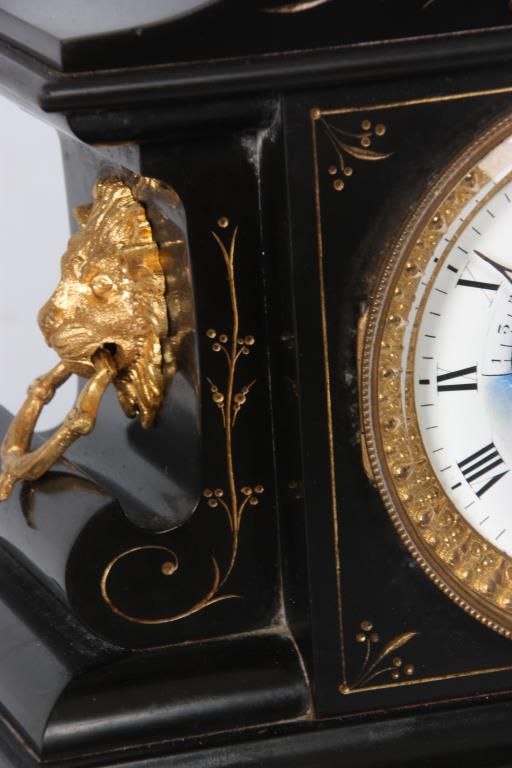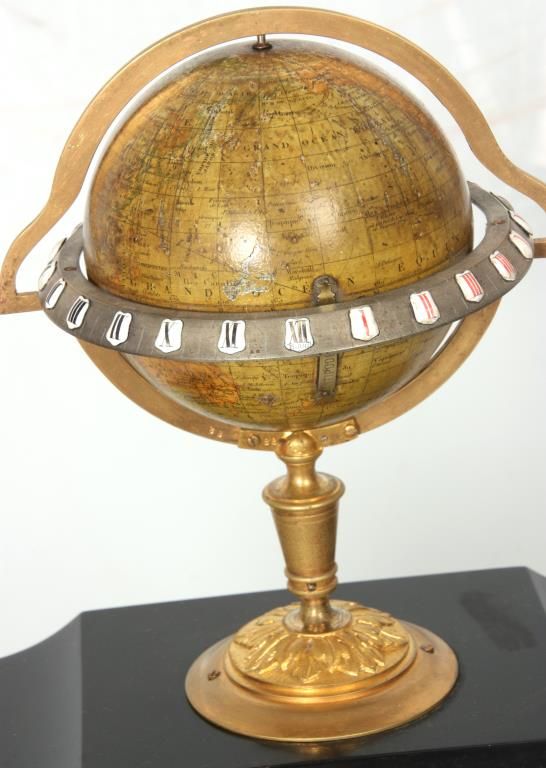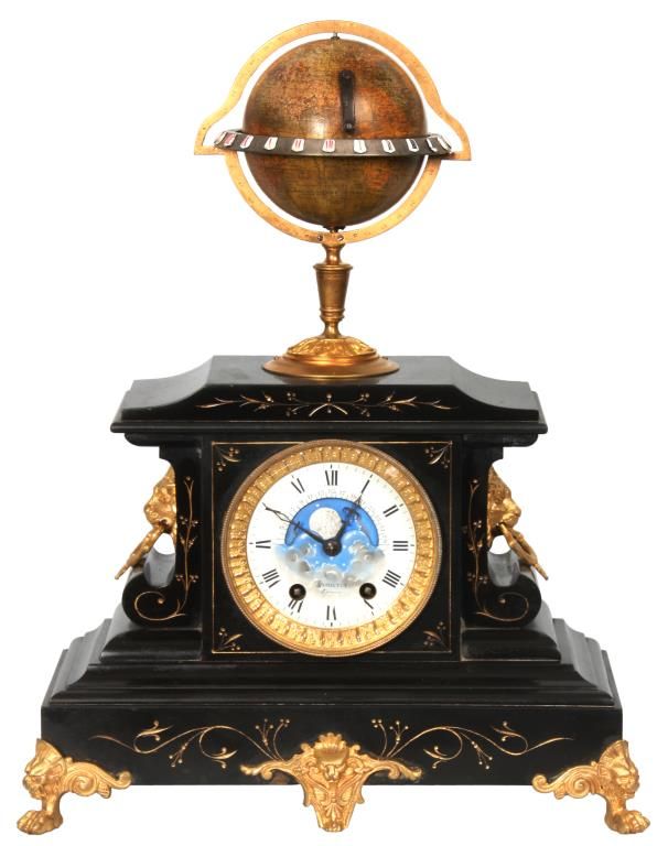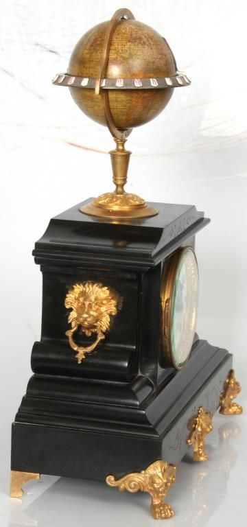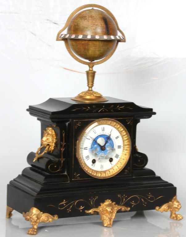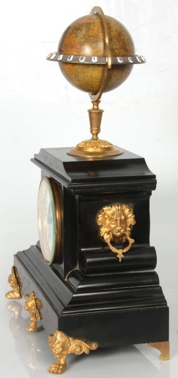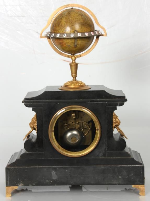 French Marble Mantle Clock w/ Annular Globe. 4 in. porcelain dial has black Roman hour numerals and inset moon phase dial; has a square, brass spring driven movement, strikes on a steel bell with brass pendulum. In a black marble case with figural lion’s heads on the sides and claw feet; the top of the case is mounted with a terrestrial globe on a brass stand, has an annular chapter ring along the equator and indicator drops down from Paris, France, the globe is signed “Edouard Serin, Paris”. 18 in. high x 14 in. wide x 6.5 in. deep