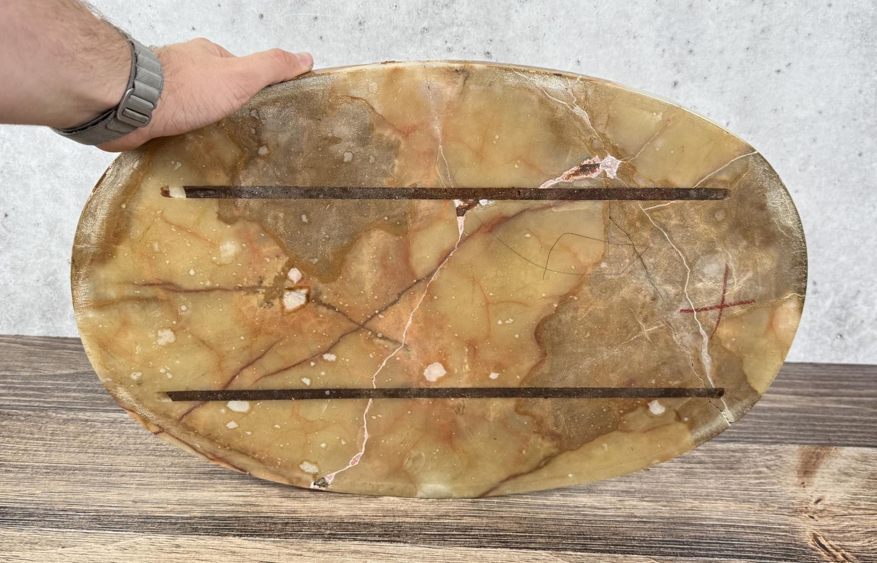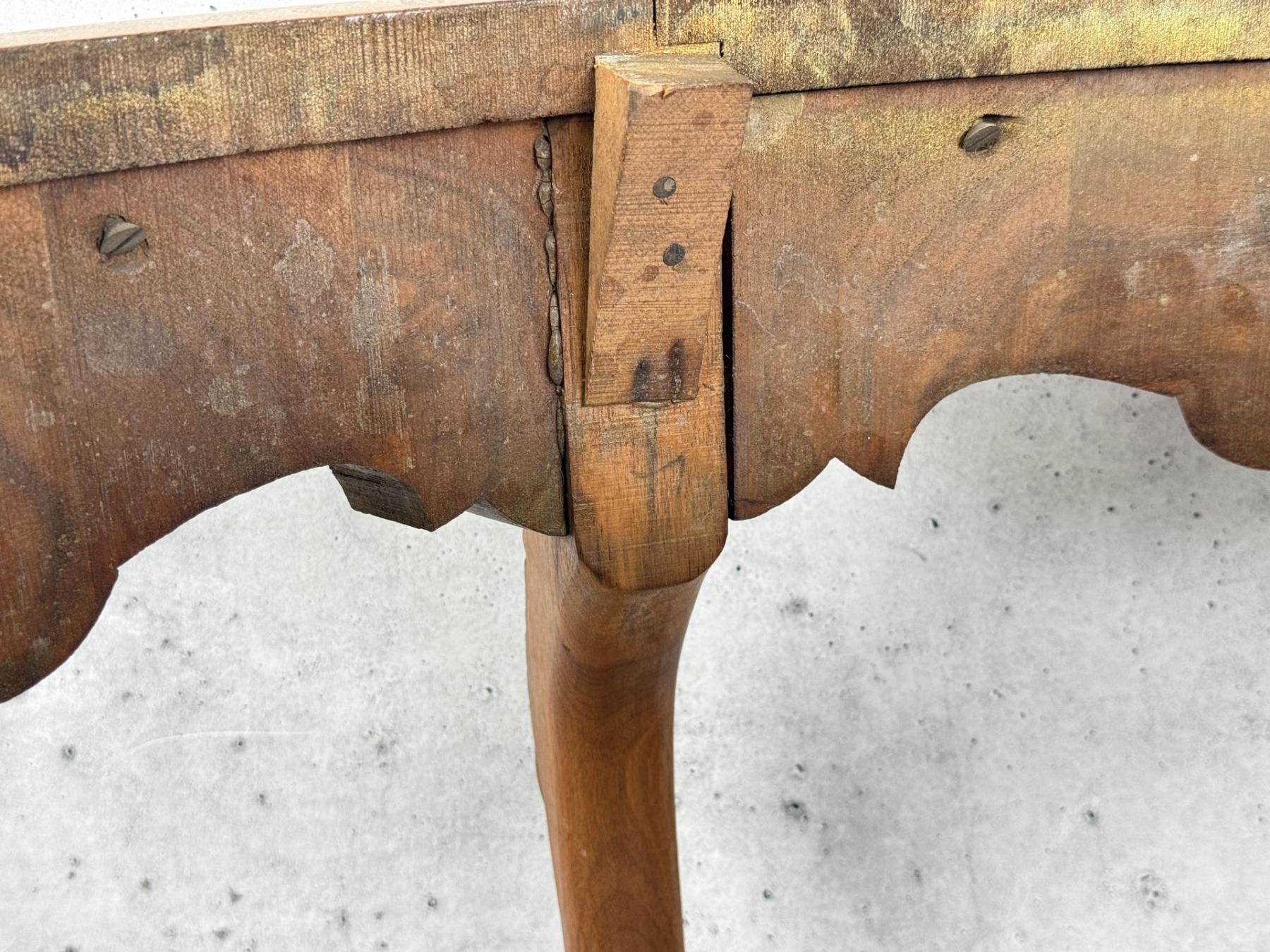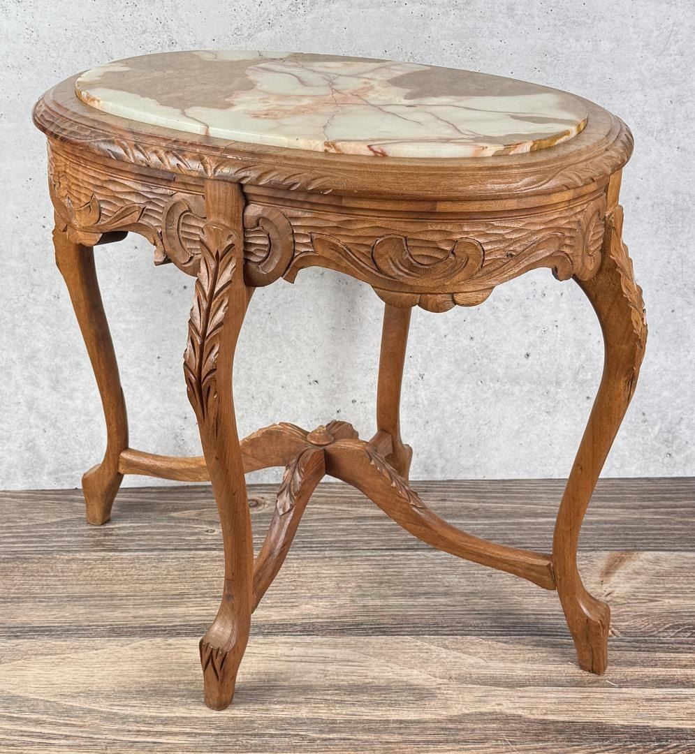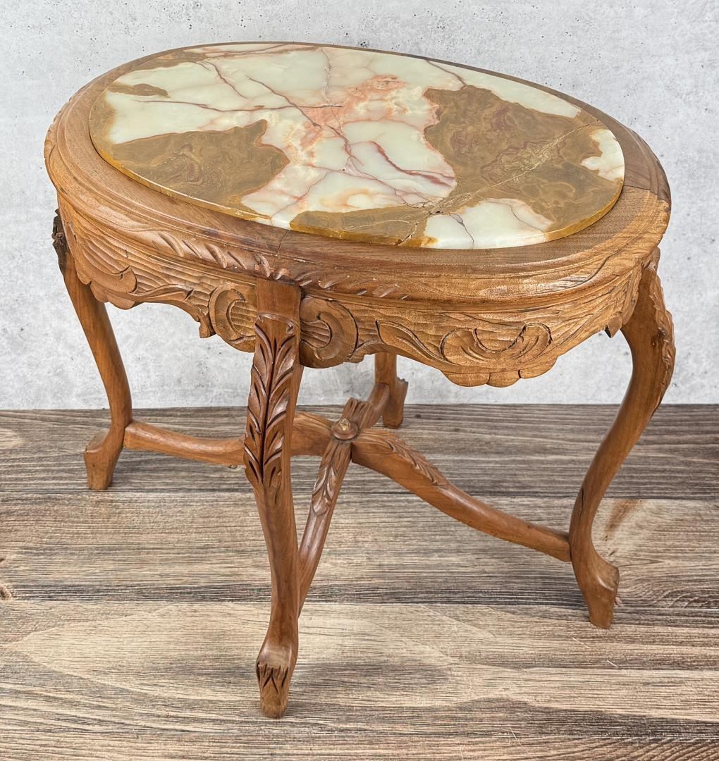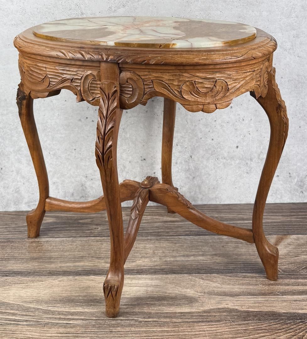 This is a 20th Century Reproduction of an 18th Century style Table. The Onyx Marble Slab had a major crack that has been repaired. 19" by 25 3/4" by 22 1/2" tall and weighs just under 30 pounds all together.