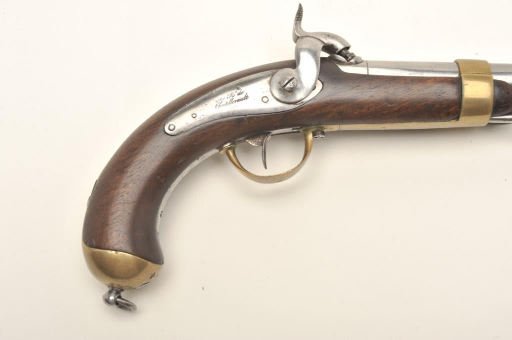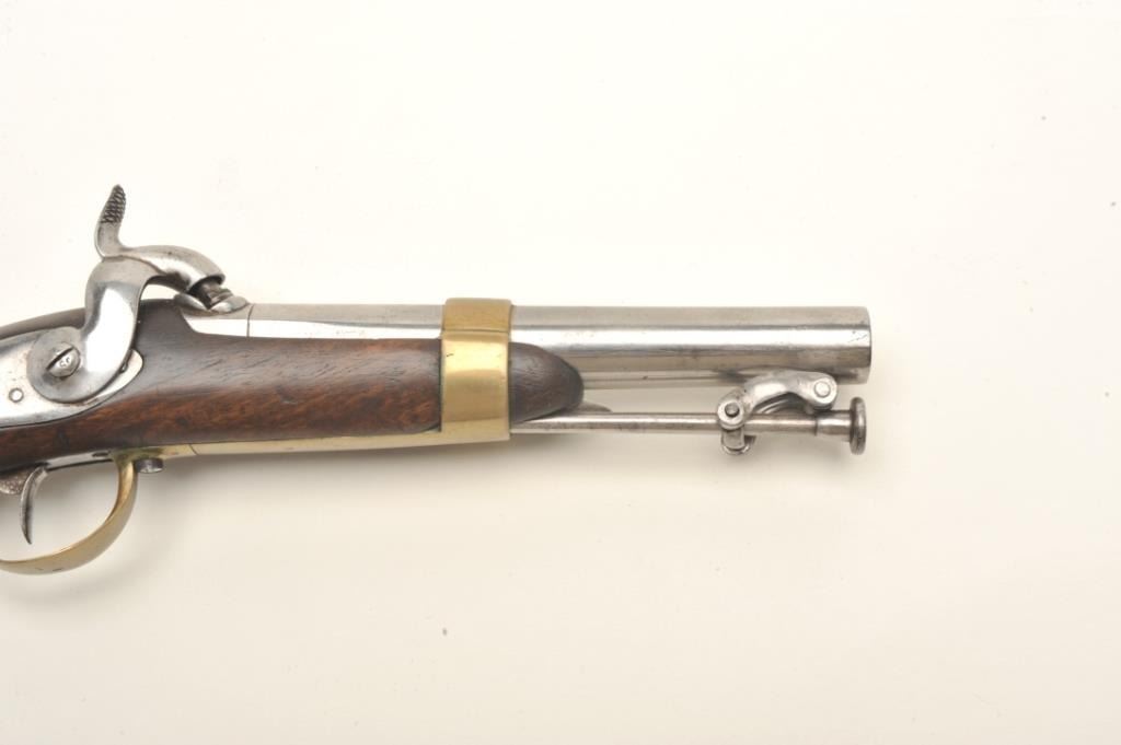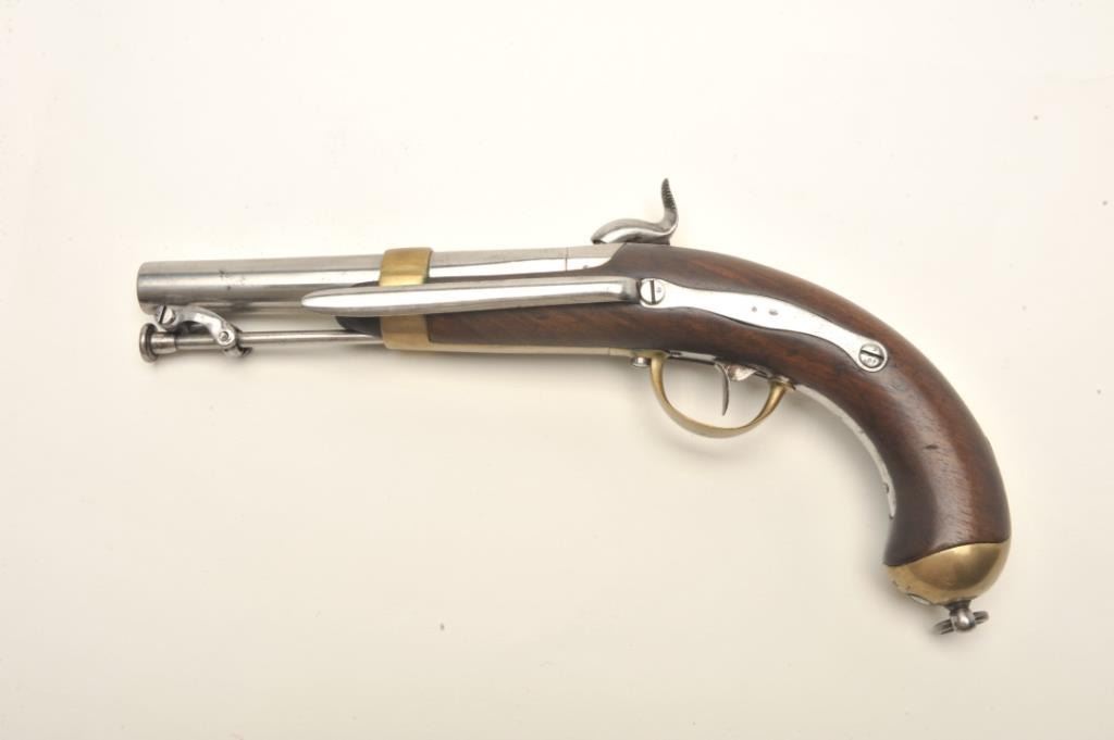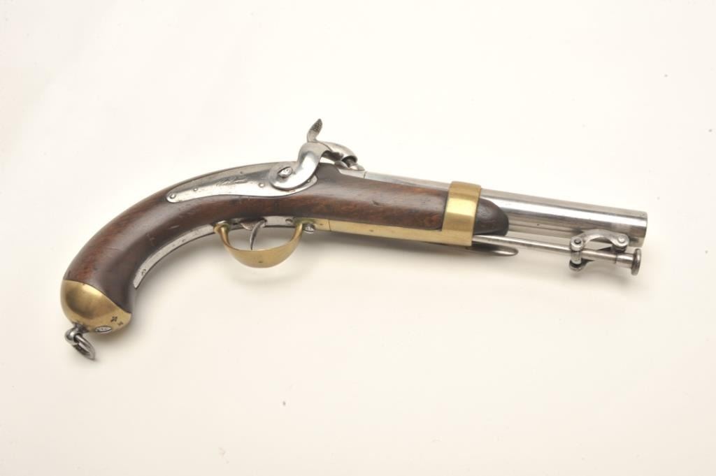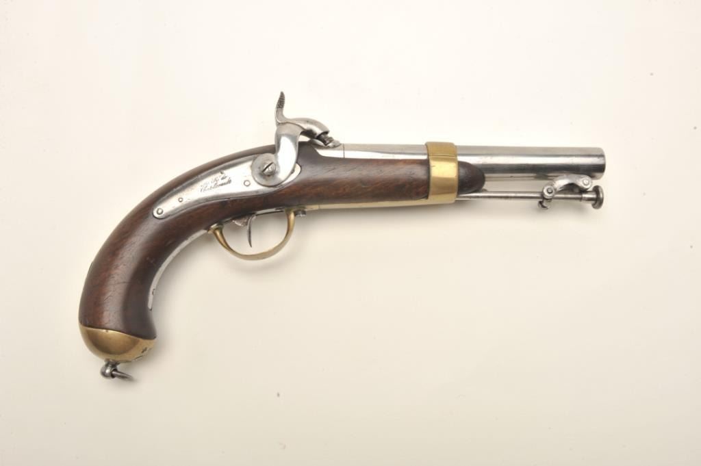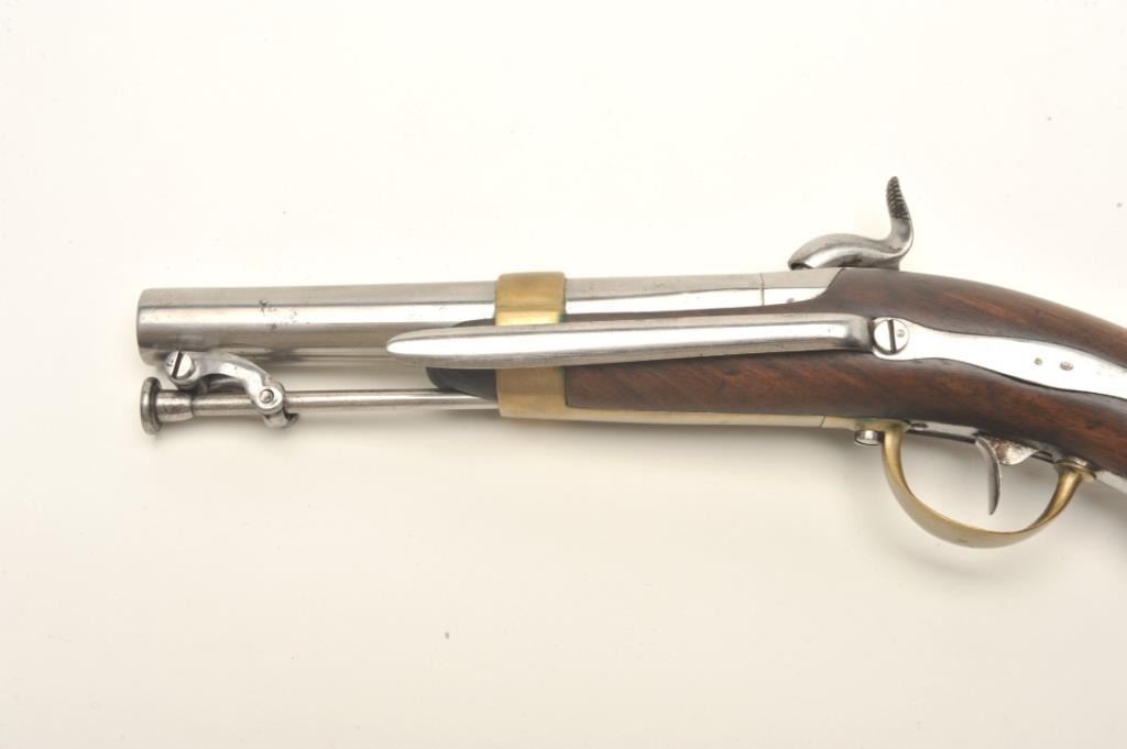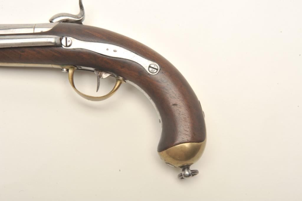 French Marine Single Shot percussion pistol, Model 1837, .60 caliber, brass mounted with swivel ramrod, belt hook and wood stocked, in overall good + condition with crisp action and markings, good wood. (Antique).Est.: $500-$800.