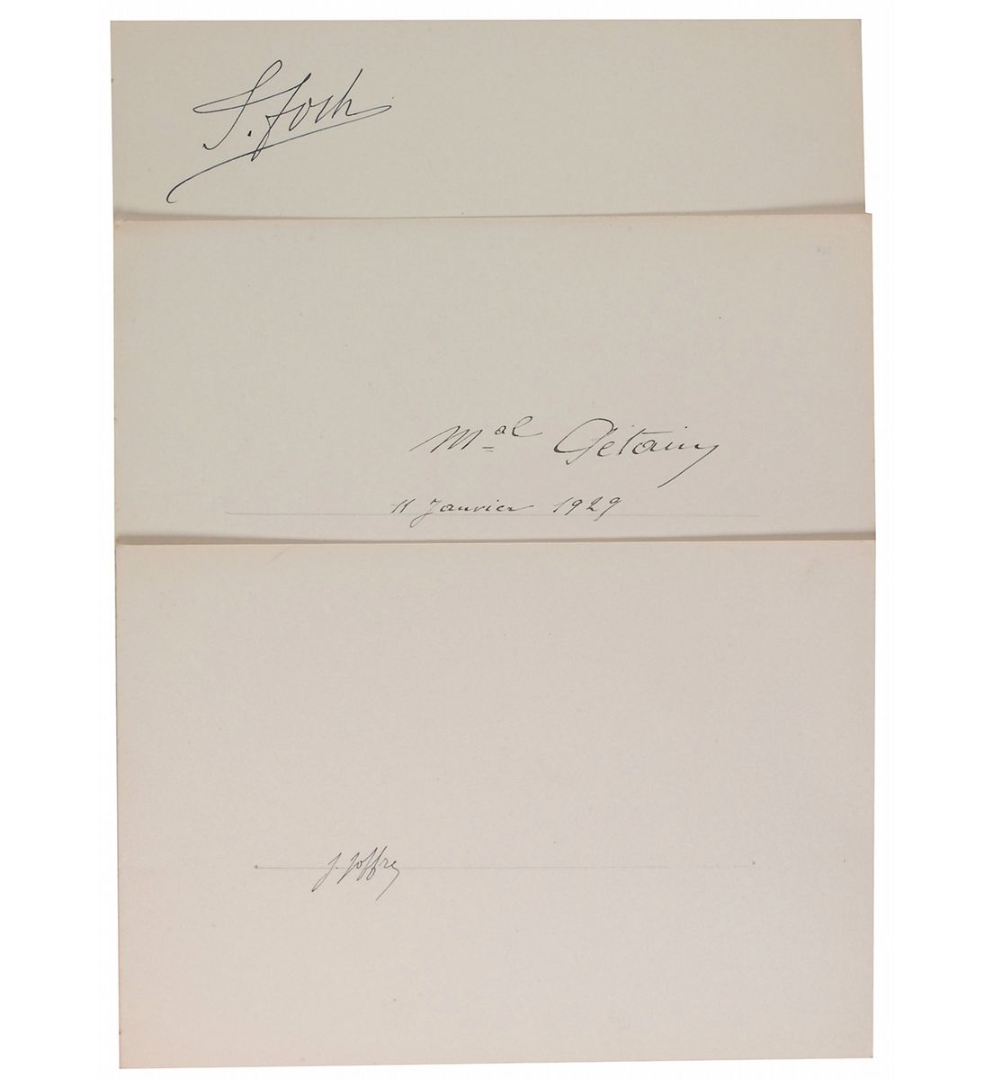 Vintage ink signatures of Ferdinand Foch, Joseph Joffre, and Philippe Petain on individual off-white 10 x 7 cards. In overall fine condition.