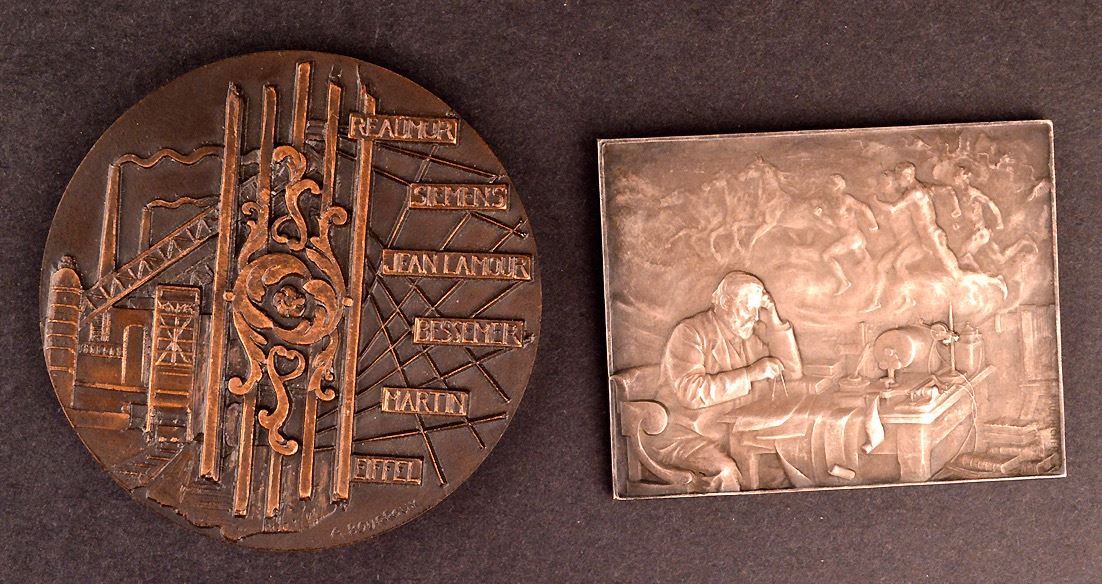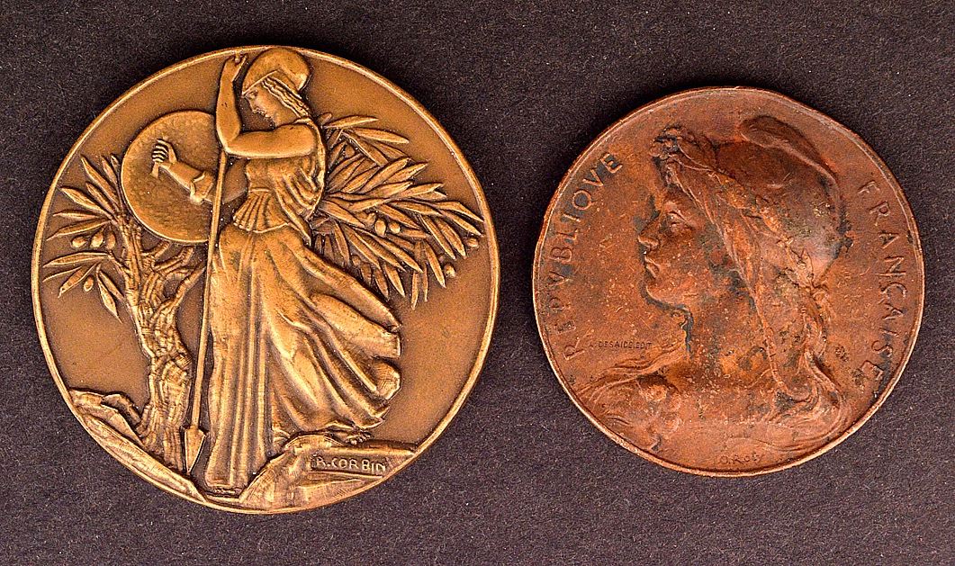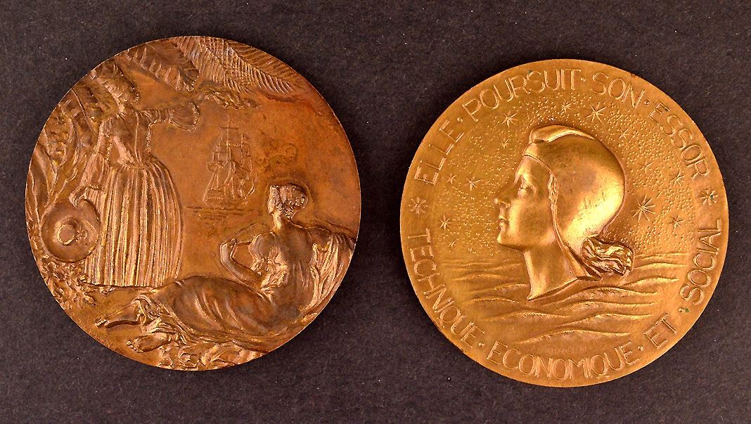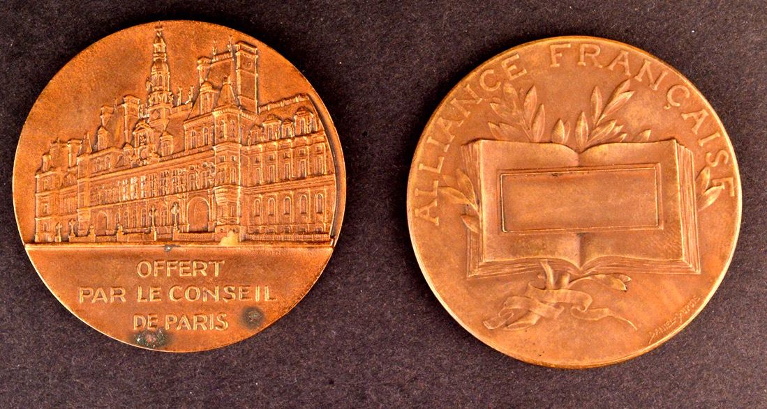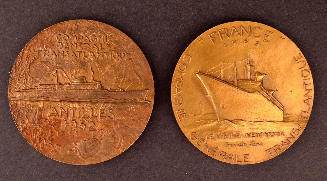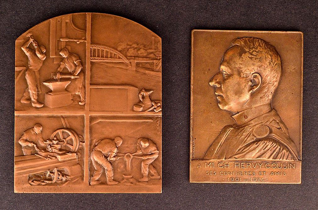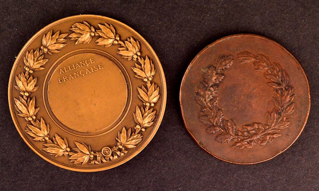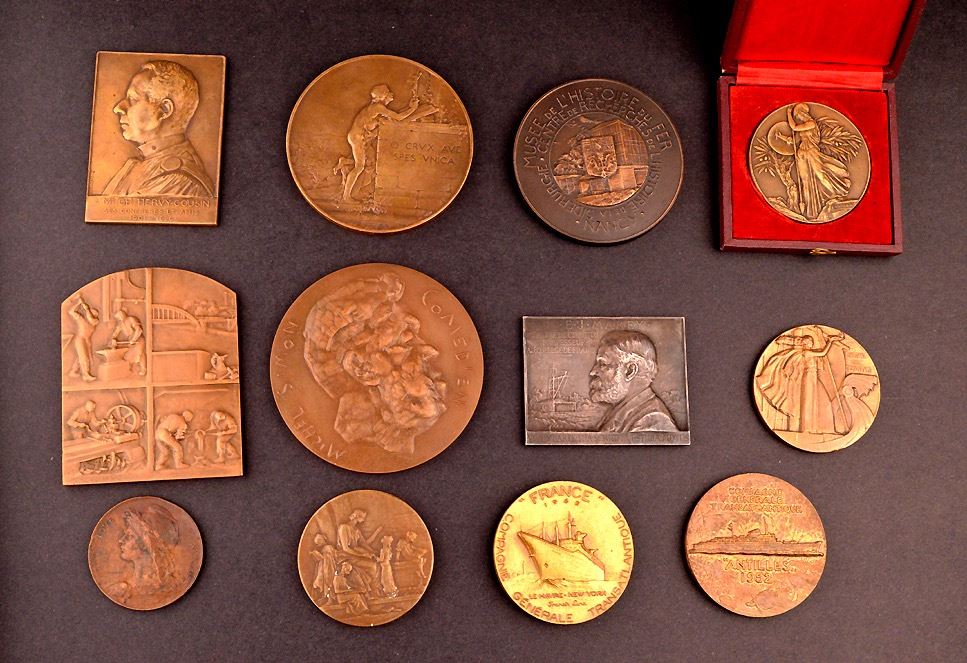 France, (1)- Republique Francaise, Ae, 42mm, pre-1900; (2)- Alliance Francaise, Ae, 50mm, pre-1900; (3)- As last, later issue, in fitted case; (4)- "Offert par le Conseil de Paris", Ae, 50mm; (5)- rectangular medal, "A Me CH. Hervy-Cousin, ses Confreres et Amis, 1901-1926", Ae, 70 x 51mm, uniface; (6)- Religious Medal, "O Crux Aue Spes Unica", Ae, 72mm, turn of 20th century; (7)- rectangular medal, E.J. Marey, Professeur, Ae, silvered, 50 x 63mm; (8)- Companie Generale Transatlantique, Antilles, 1952, Ae, 54mm; (9)- another, Companie Generale Transatlantique, Le Havre-New York, 1962, Ae, 54mm; (10)- Musee de L'Histoire du Fer, Nancy, Ae, 68mm, 1974; (11)- Rectangular medal, scenes depicting industry, without text, Ae, 81 x 66mm; (12)- Michel Simon, Comedien, 1966, Ae, 81mm; Fine to EF, most VF; total of 12 medals