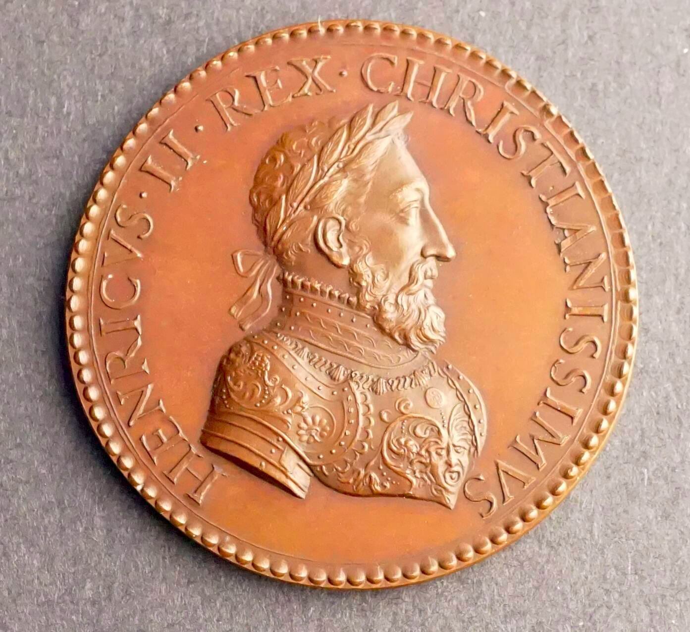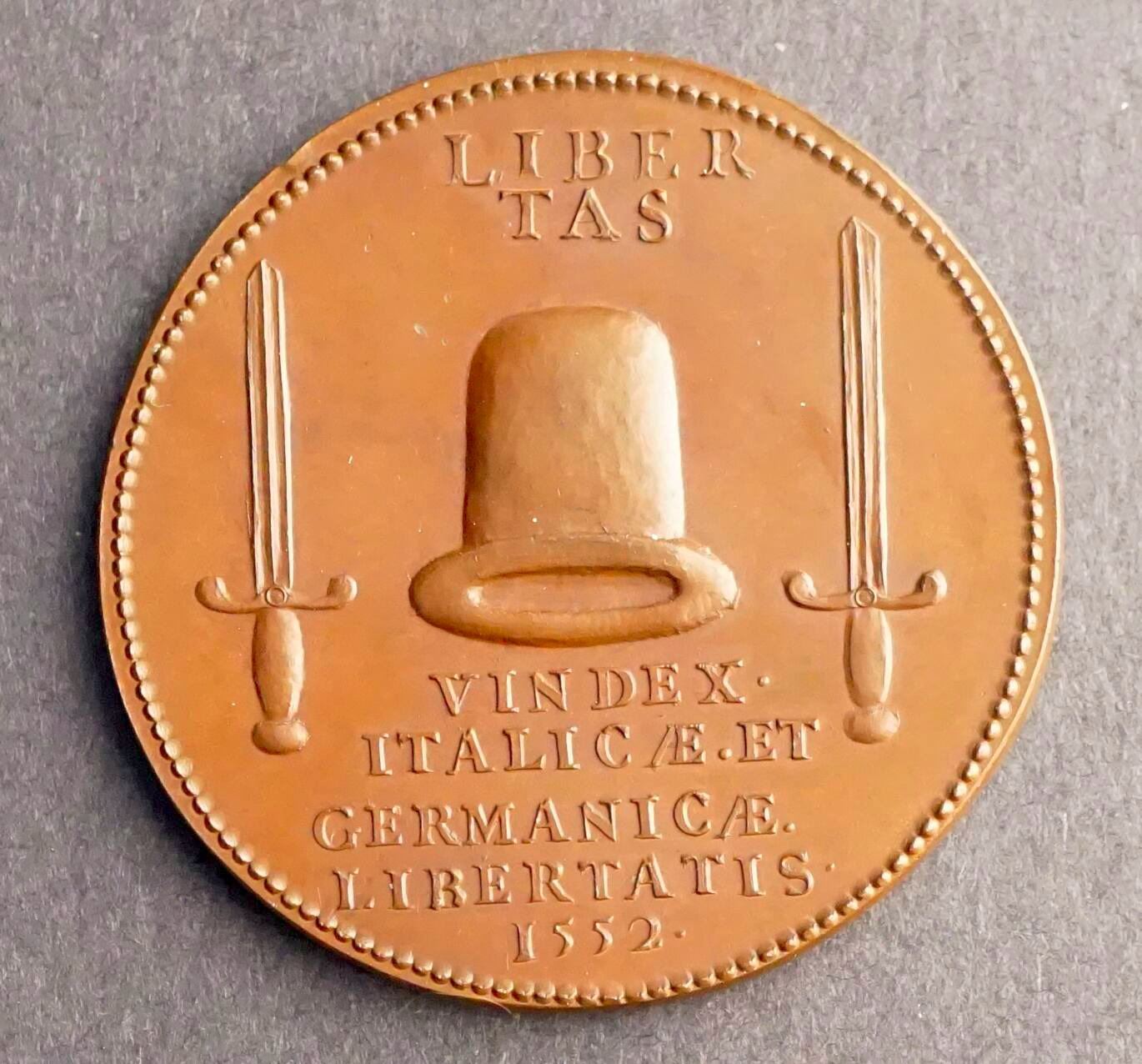 “HENRICUS II REX CHRISTIANISSIMUS” Bust of Henry, right, laureate and armoured, all in a beaded border. Reverse has a Pileus (cap of liberty) between two daggers. This reverse is copied from the famous "Ides of March denarius of Brutus, struck in 42 BC to commemorate the assassination of Julius Caesar. Latin text Above: LIBERTAS. Below: VINDEX ITALICAE ET GERMANICAE LIBERTATES 1552. A small reverse edge nick at 11:00; and some field curvatures on the reverse, but no doubt as struck. Condition is AU+. Clearly a piece with some considerable age. 58 mm, 84.5 grams. High grade, with glossy surfaces.