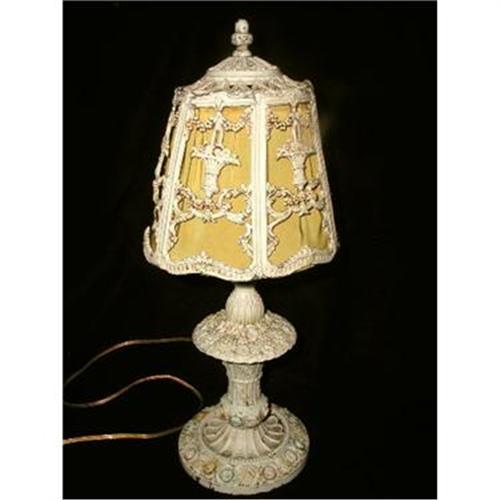 Unique 19th century French metal lamp displays baskets of flowers and fruit on hung garlands in the six open work metal panels of the outer shade. Bright yellow original silk liner is attached to a separate metal frame on the interior. Pedestal and base depict additional floral with hints of blue,green and yellow. Antique cream background has very minor wear to the finish on shade only. Beautiful work on the open weave top of shade. We have totally rewired and works perfectly. Holds one large based bulb in lower wattage due to the silk liner 25-40. Measures 17.5H X 7W X 7L.