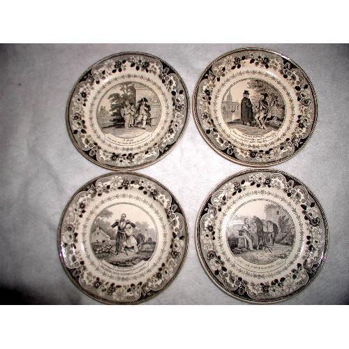 </font></strong>Set of 4 black and white French military plates are signed on the back of each "Louis Lebeuf Montereaul" in black script writing. Beautiful black and white floral surrounds each scene outlined with a tulip border. The set includes,"La Conversation","Y dit que vous avez une Jambe de bois de nassance","Le Misantrope On peut me'priser souverainement l'espece humaine mais cracher sur les vendanges!jamais", "Quoique Fautive J'aime encore mieux "etre saoul que d'etrebe'te,ga dure moins longteins". All in wonderful condition,no nicks,chips or cracks. Two plates are darker on the back. Make a wonderful wall hanging. Measure 8L X 8W X 1H. </font>