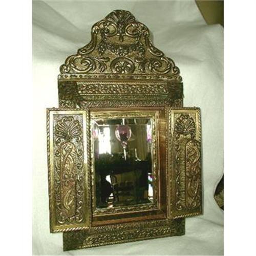 Fabulous late 19th Century Louis XIV hammered brass over wood repoussage grooming station comes from Belgium. Designed to hang beside the front door to check ones appearance before leaving the house. Includes sable shoe brush as well as clothes brush with same hammered brass on back which hang inside each of the doors covering the beveled mirror enclosed in beaded brass. The exterior is Louis XIV with small rectangular mirrors on three sides for keeping enemies at bay. Antique hanger on back with the original blue label which reads "Magazeine Tamse Sassenstron Wolls". The patina of the brass has aged to a fine antique brass with darkening in the recessed intricate work. Excellent condition. Measures 26.5H X 14.5L X 2.5D.