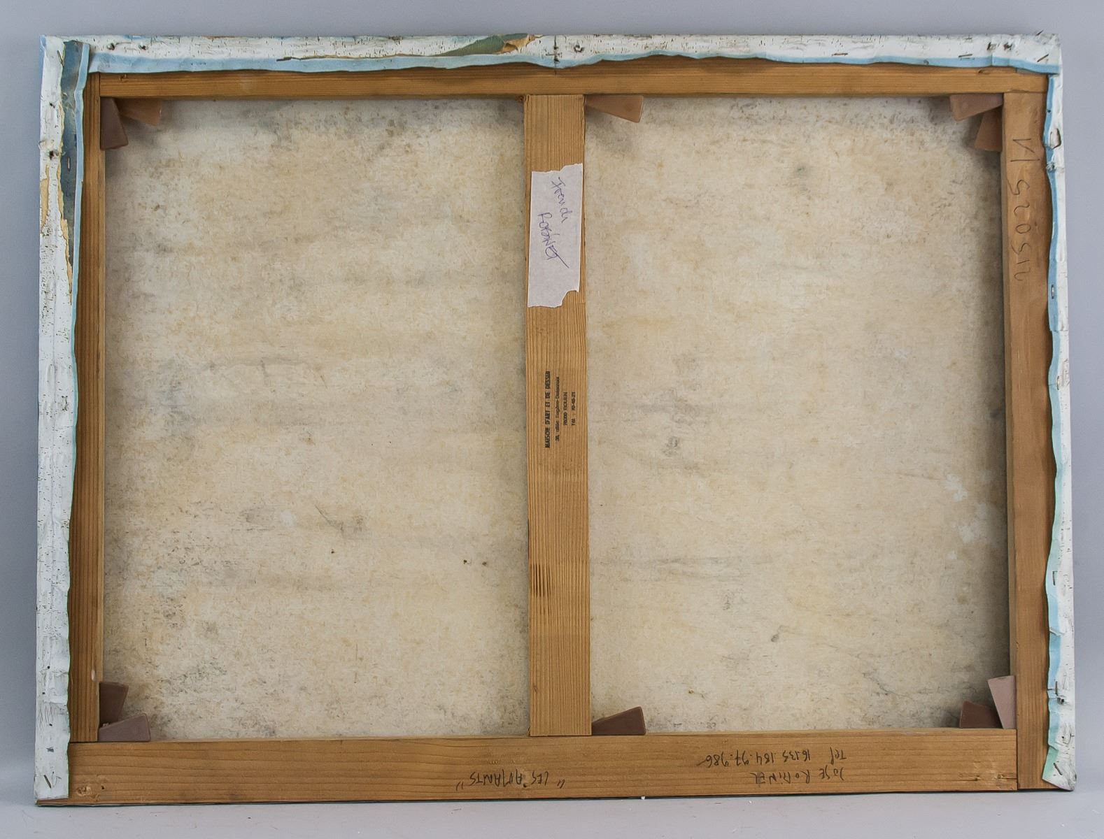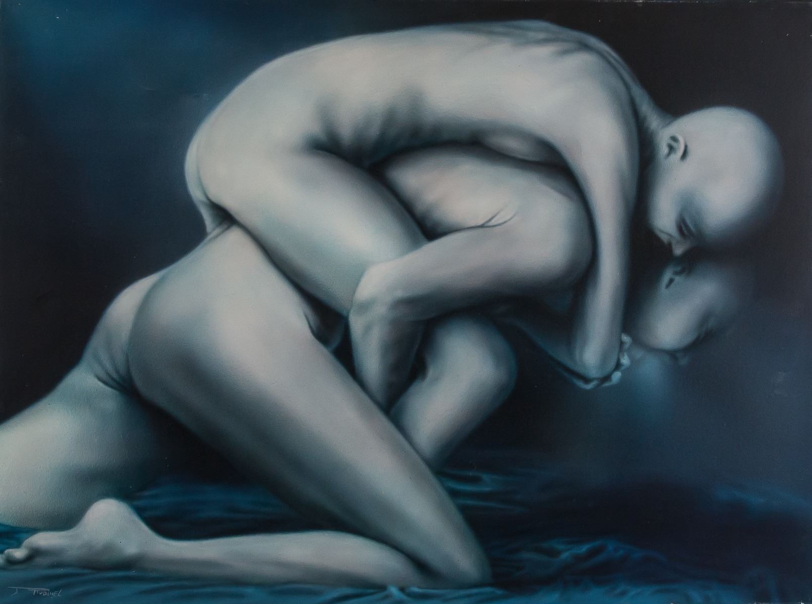 Mixed media on canvas. French school. Featuring two nude figures. Signed J. RoBiNET on the lower left corner. Entitled "LES AMANTS" on verso. Inscribed on stretcher bar MAISON D'ART ET DE DESSIIN / 36. allee Eugene-Delacroix / 76000 ROUEN / Tel: 70-49-21 on verso. 75 x 54 cm (29.5 x 21.3 inches). PROVENANCE: Private Canadian collection