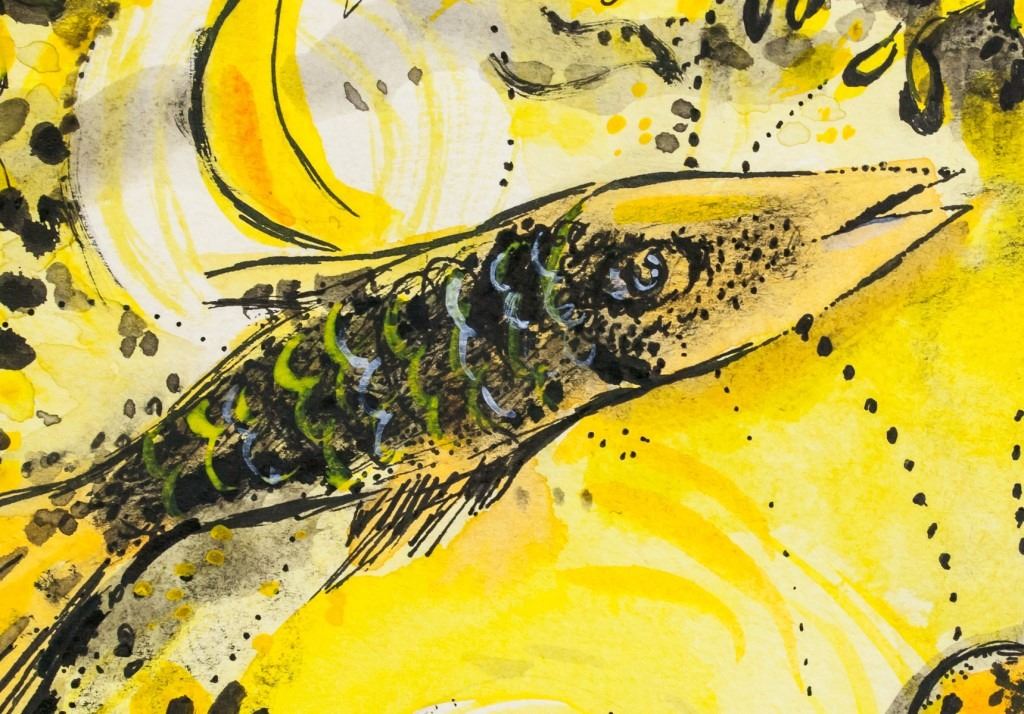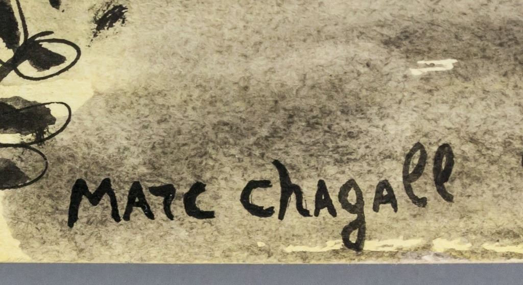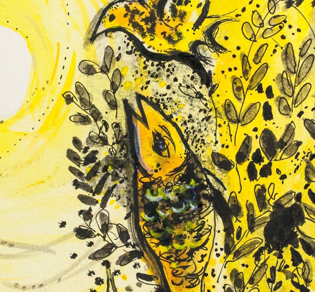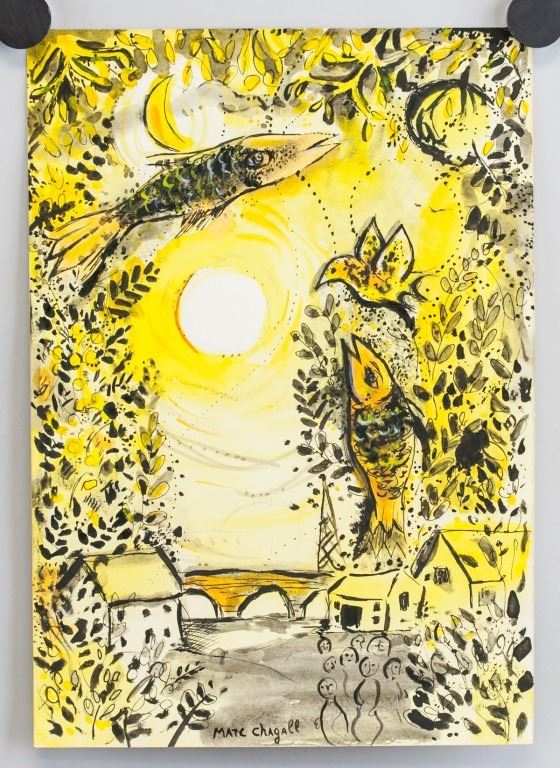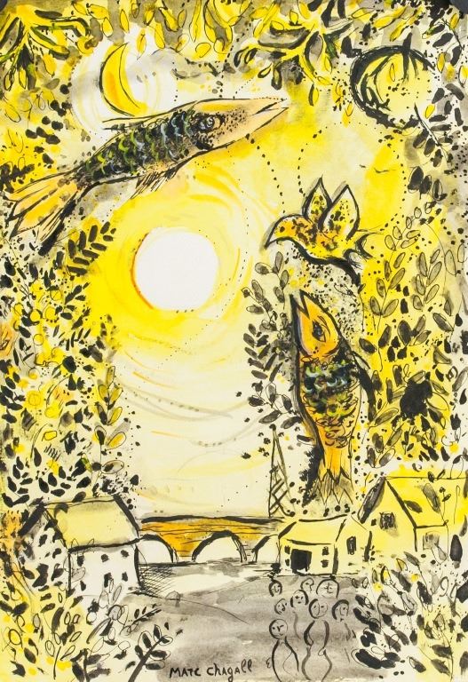 Mixed media and ink on paper. Featuring surrealist image of fish in the sky. Rendered in bright yellow. Signed "MARC CHAGALL" to the bottom. 29.5 x 20.5 cm (11.75 x 8 inches).