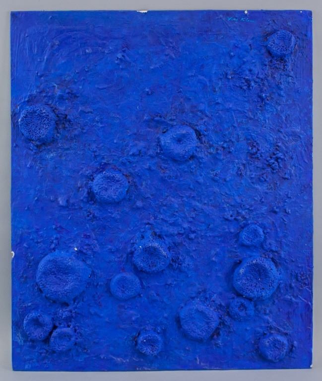 Mixed media on board. Featuring blue composition with three dimensional protrusions. Signed "Yves Klein" to the top right. Label on verso reads "HAUSER&ORCHARD GALLERY / Yves Klein / monochrome blue". 54.5 x 45.5 cm (21.5 x 18 inch).