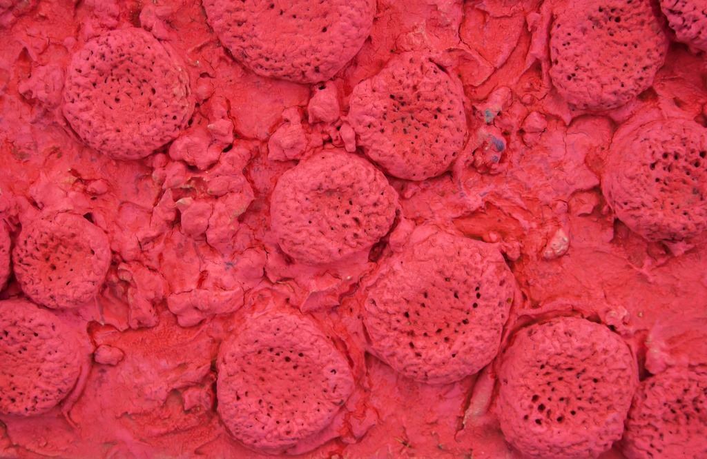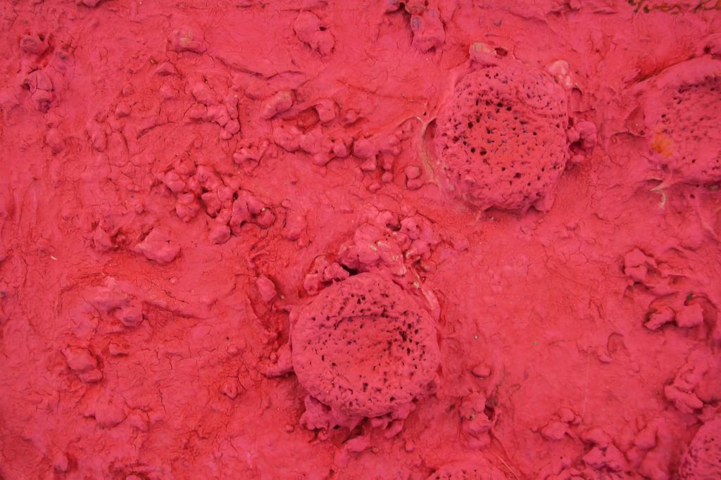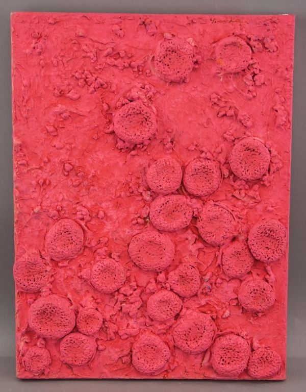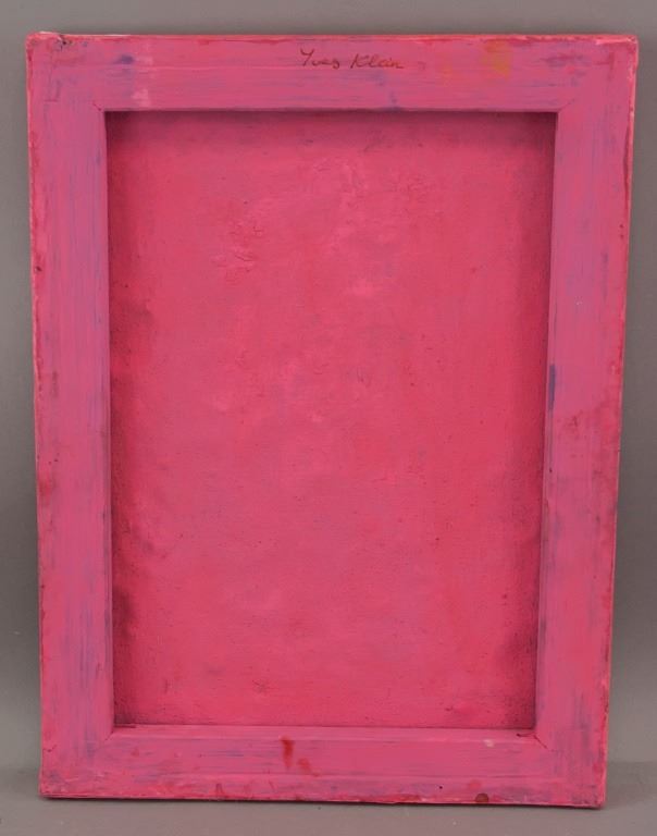 Mixed media on canvas. Featuring abstract composition of pink tone, with textured circles. "Yves Klein" to the top of the stretcher bar. 40 x 30 cm (15.7 x 11.7 in).