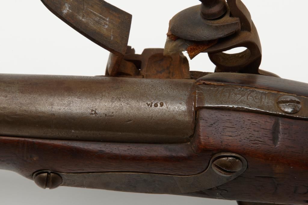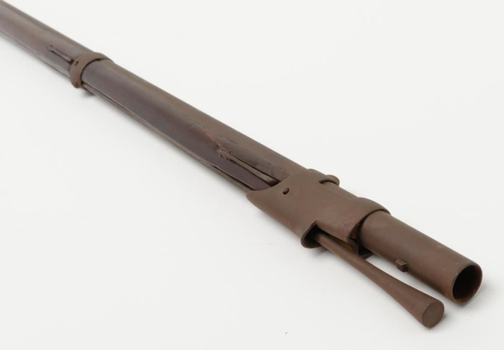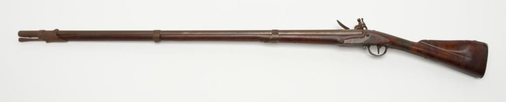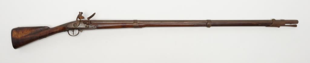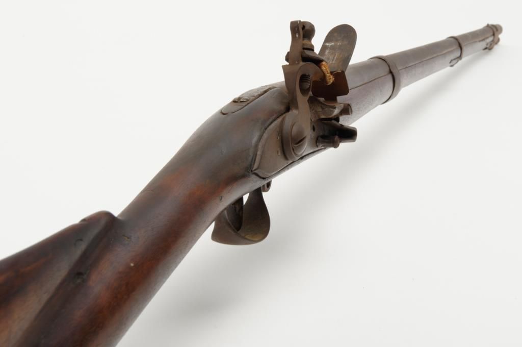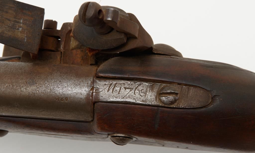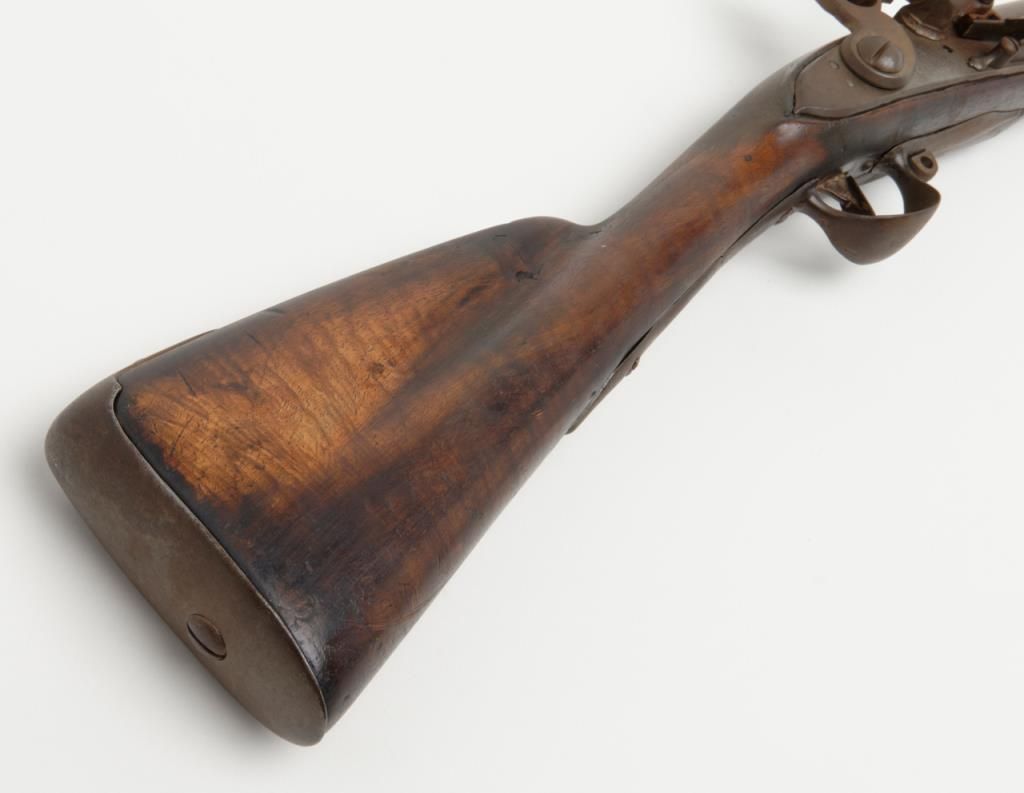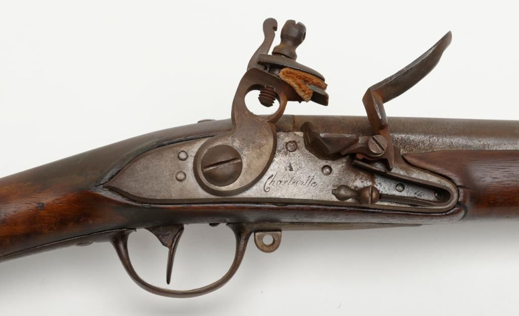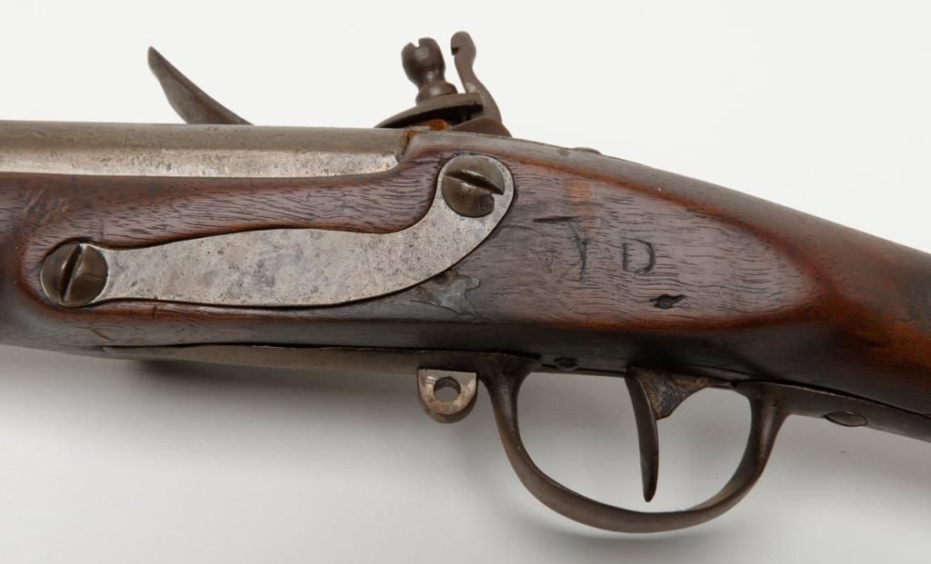 French Model 1763 flintlock musket by Charleyville Armory showing period restock in figured or striped wood which may possibly be American. The barrel measures 44ā and the musket is 59 ¼ā overall in .70 caliber. The metal surfaces show abrown patina finish with scattered light to moderate erosion and pitting. The lock is in its original flintlock configuration with the top jaw and screw possibly period replacements. The sling swivels have been removed and the stock shows some breaks, some losses and has been broken and repaired at the wrist. The shape and stocking show American traits. There are carved initials right over the trigger on the left side which reads āw Y Dā which are over marking the French V.inspection. Very possibly a revolutionary war used musket which would be worth testing the wood. A French style ramrod is included. Est.: $1750-$3500