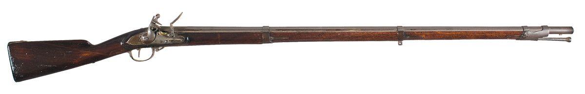 Features a bayonet lug on the bottom of the barrel, three spring retained barrel bands and replacement iron ramrod with a tapered end. No visible markings, iron mountings and a detachable brass flash pan. The stock has a dished out cheekpiece on the left side of the comb. There is a sling swivel mounted directly in front of the trigger guard, with the one on the middle barrel band missing.