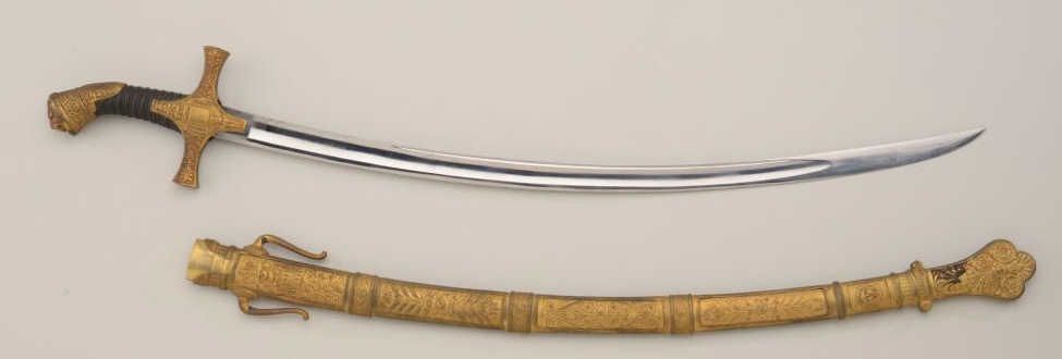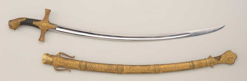 French Model 1822 Tambour Major (drum major) sword, signed "Manseaux a Paris" on reverse of throat on scabbard, and dated 1823 on top of blade with Klingenthal Arsenal marking. Also, shows 1823 date on back of guard withsmall proofs. The sword shows elaborate grip and mountings with cast brass guard, scabbard mounts; showing fancy florals, drums, bugles, and helmets with fancy lion head pommel, all of which show most of anoriginal gold gilt that has toned nicely. The grip is leather over wood with wire wrap and in good condition. The blade measures 32" and is in excellent condition, showing its bright original polish. The mounts arecompletely uncleaned and show at least 50-70% of their gold finish, which is going to a nice uncleaned patina. The mounts and sword are very crisp and completely untouched in modern times. Note: A nearly identicalsword sold at Hermann Historica Auction, May 5, 2011, lot #4351 for approximately $7,000. Est.: $1,750-$3,500