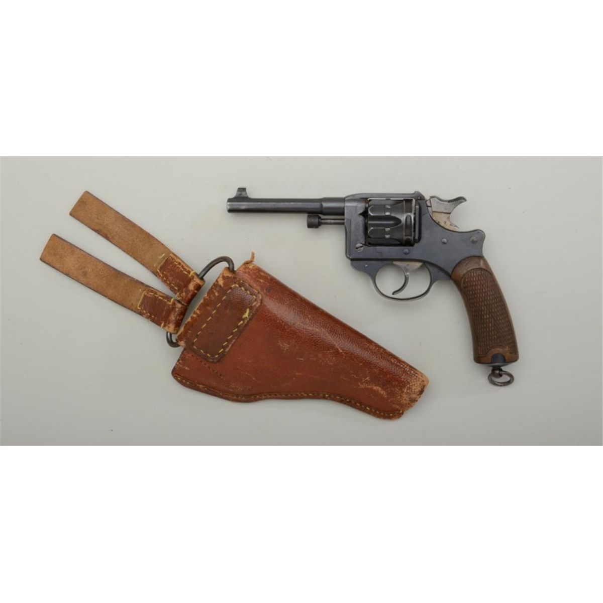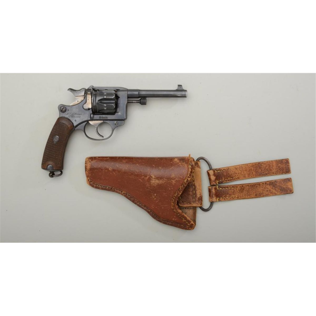 French Model 1892 DA revolver, 8mm cal., 4-1/2” barrel, military style mat black finish, checkered wood grips, lanyard ring, #G90883, accompanied by a pebble finished brown leather holster. This gun is inoverall very good to fine condition showing the majority of its original finish, very good bore, action, markings and grips; holster good overall showing scuffing and wear. Est.: $225-$450.