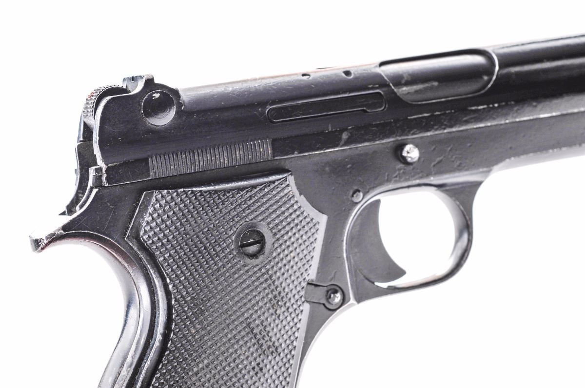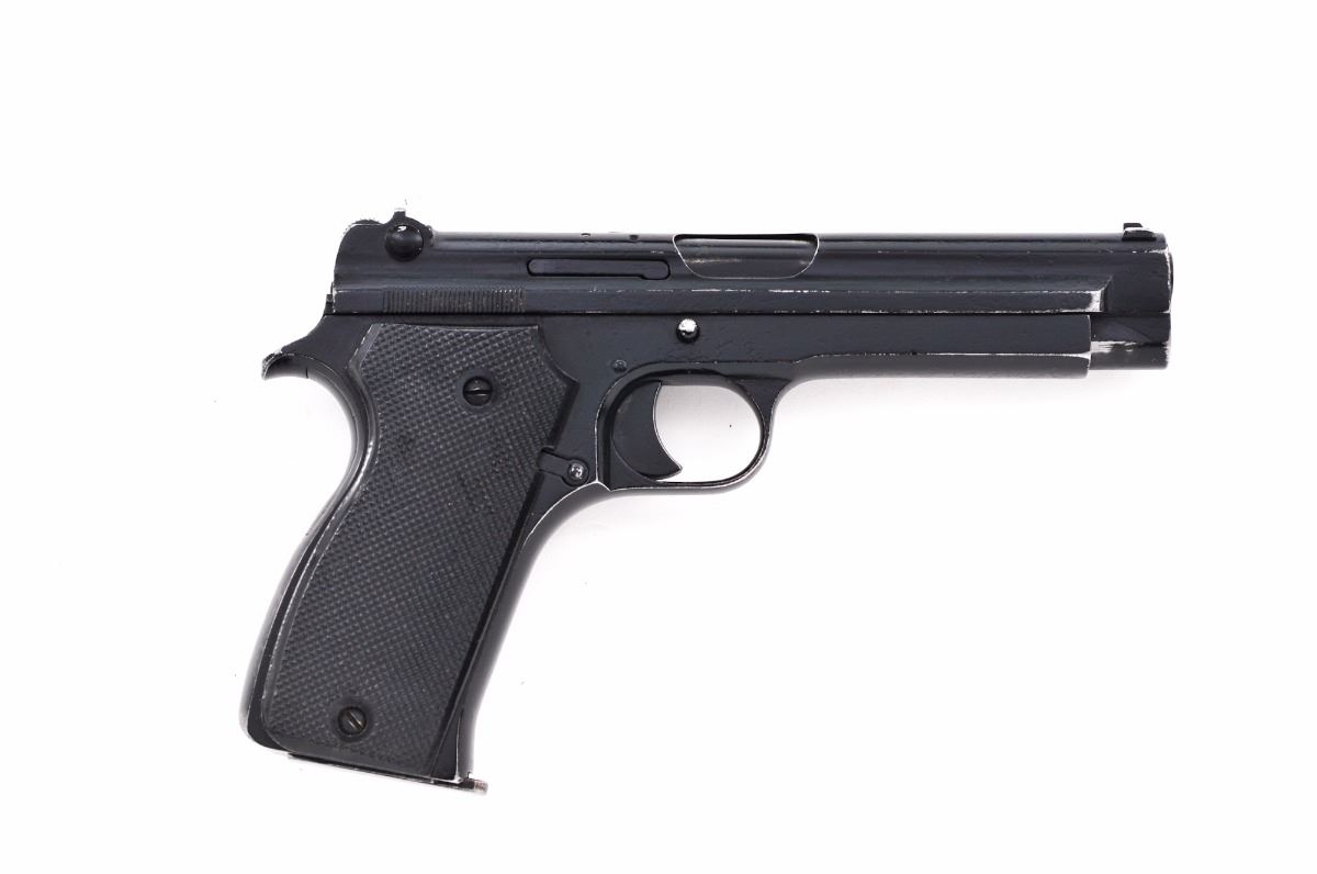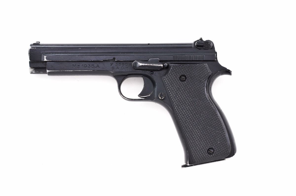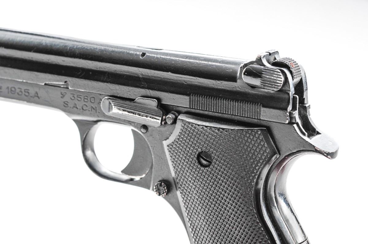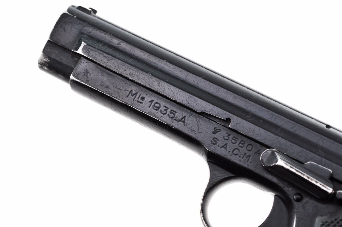French Model 1935A Semi-Automatic Pistol, #G3580A, .32 French Long cal., 4-3/4'' barrel, stove black finish, factory checkered black plastic grips, with one magazine. Condition is excellent as arsenal overhauled, retaining approx. 96% black painted finish with wear at forward edges and slide release. Grips and action are good, bore is very good. Est.: $250-$400. (C&R)