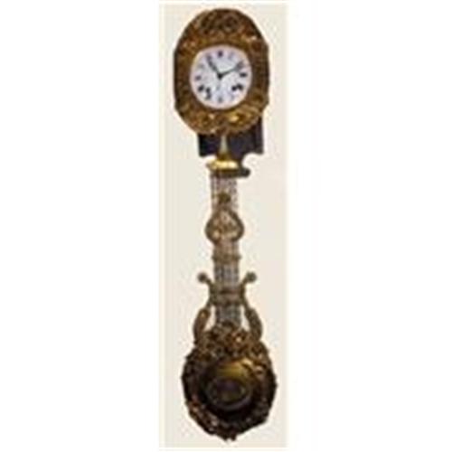 </font></strong>Delightful example of the unusual Morbier type clock with calender. Tole (tin) pendulum and case. Porcelain face. Double weighted mechanisim, striker and repeat.Morbier clocks are popular and widespread in France and Switzerland, originating mostly from the French Jura. They emerged at the end of the 17th century and were produced in large numbers up to the beginning of the 20th century. The wall clocks are distinct in their ornate box and lyre pendulum. The 3rd generation of Morez clocks, the dial surround is out of pressed sheet brass or brass hoop (solid or sheet), heavy pendulum with brass and iron rods, often with lyre-shaped decoration, with large, polished brass disc (approx. 30 cm diameter), pendulum in front of weights, anchor escapement (never verge escapement). /keepers/Silverman/html/perry.shtml More details: ~jschrein/page2.html</font>
