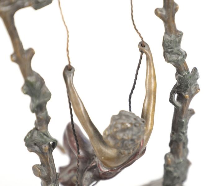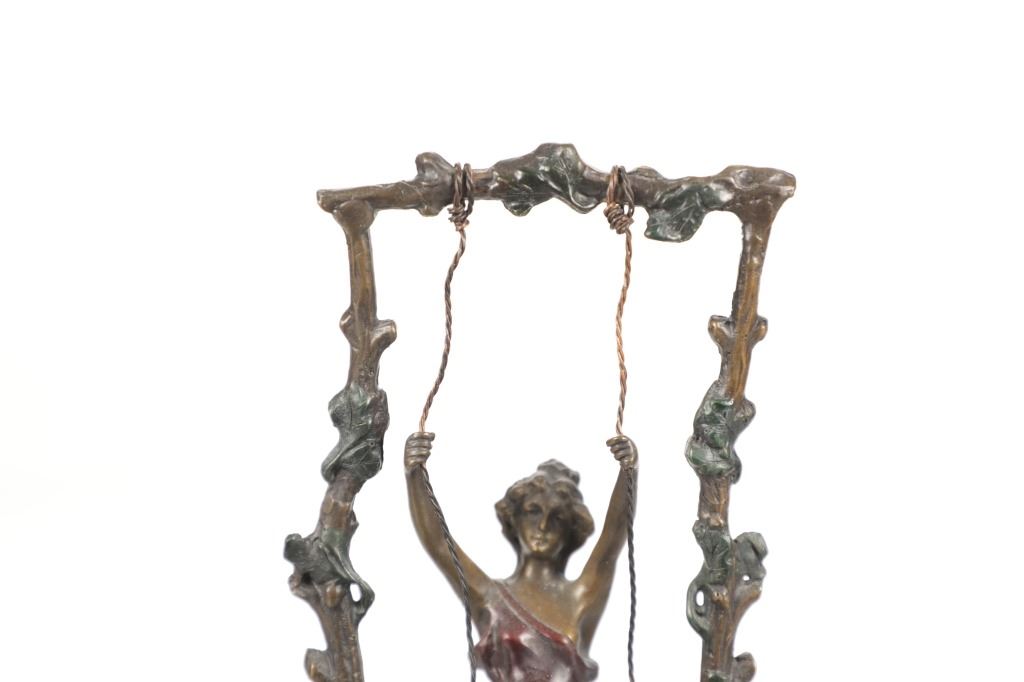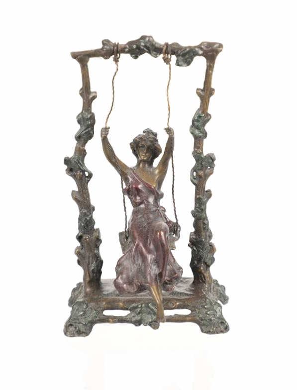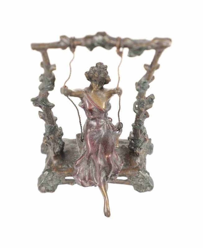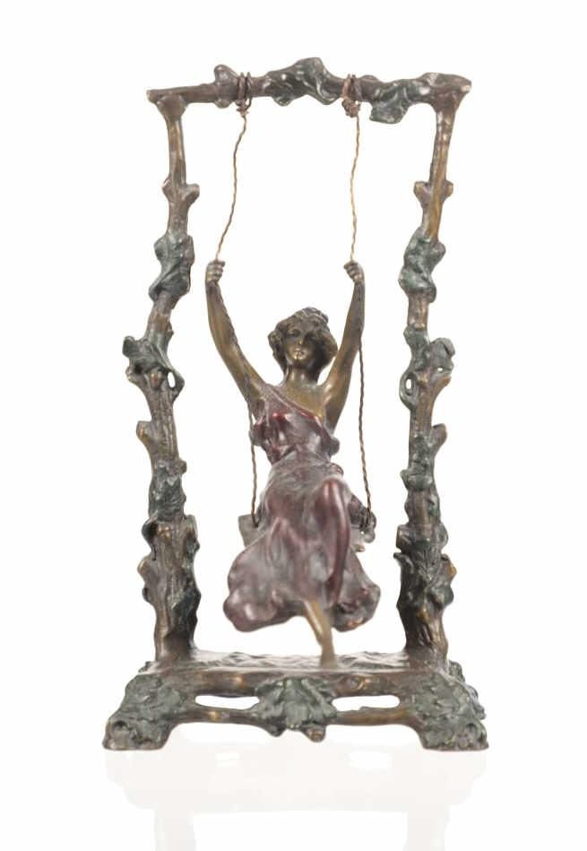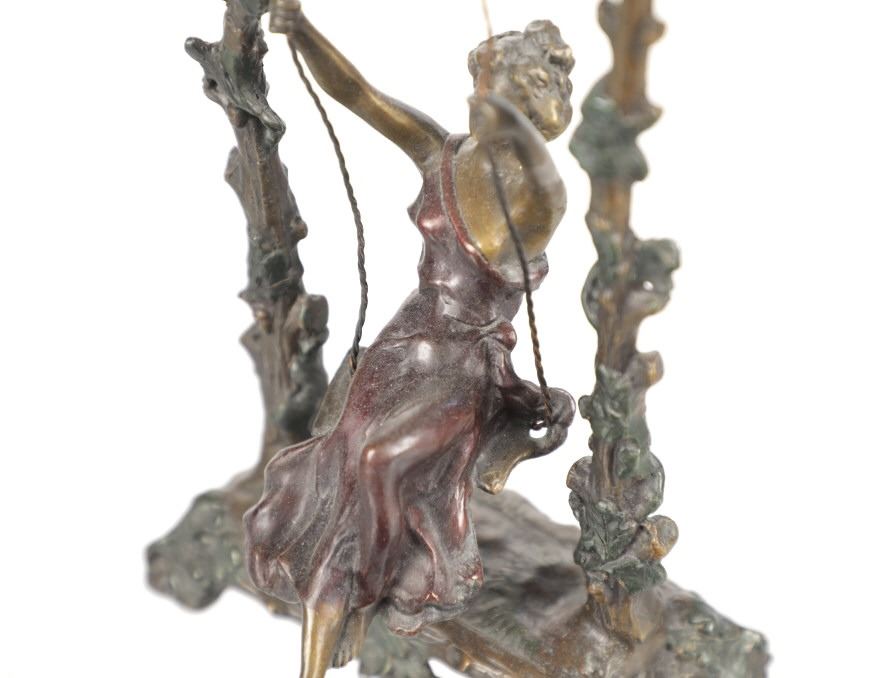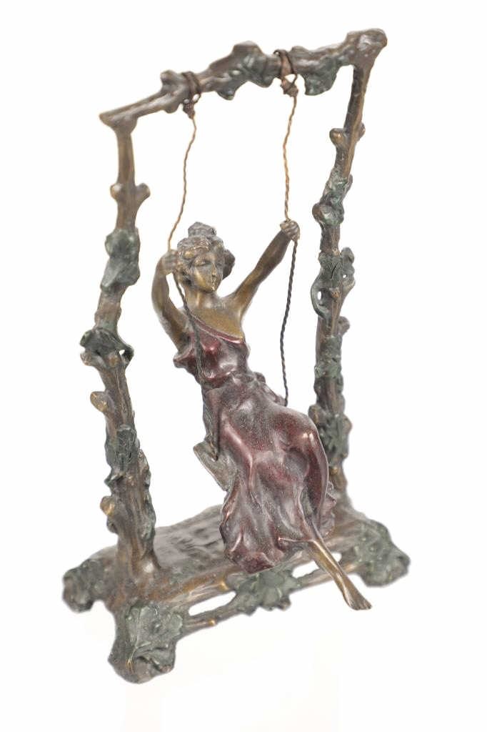 Featured in this lot is a sculpture of a French Mozeau swinging woman, circa mid-1900s. The sculpture shows a wonderfully and professionally crafted bronze construction. The bronze sculpture features a scene of a young woman in a dress on a swing that is free hanging and decorated with a floral design. The bronze is marked as follows: Mozeau - 17/100. The overall condition of this bronze sculpture is good with no obvious signs of damage. The measurements of this bronze sculpture are 10 1/4" x 5 3/4" x 5".*
