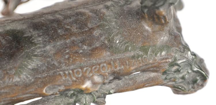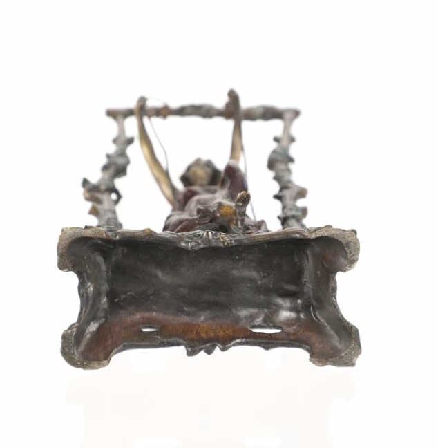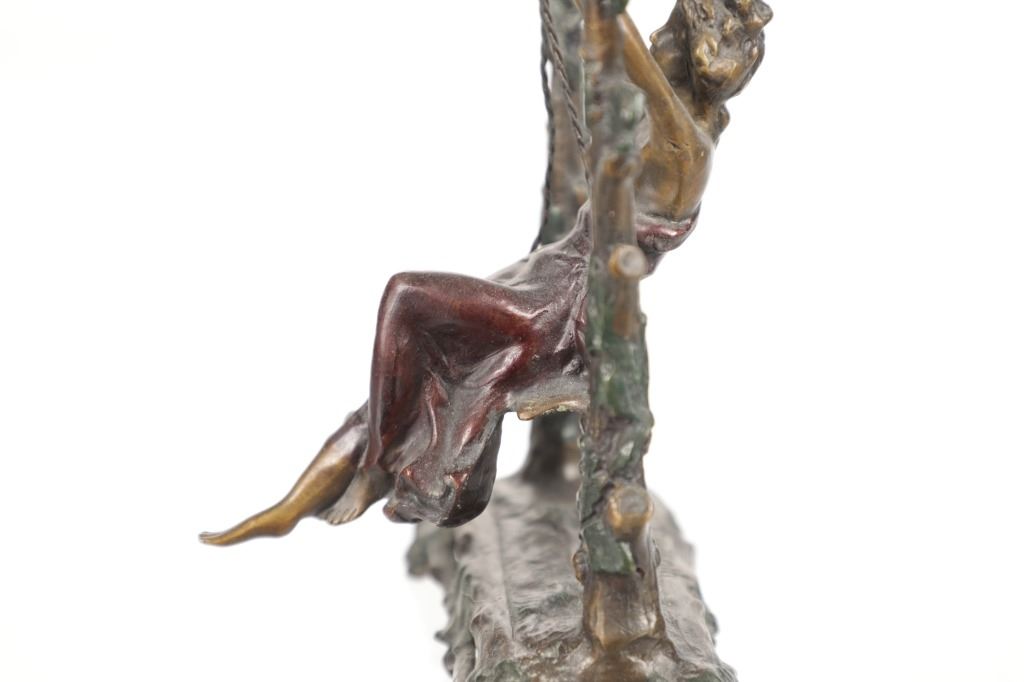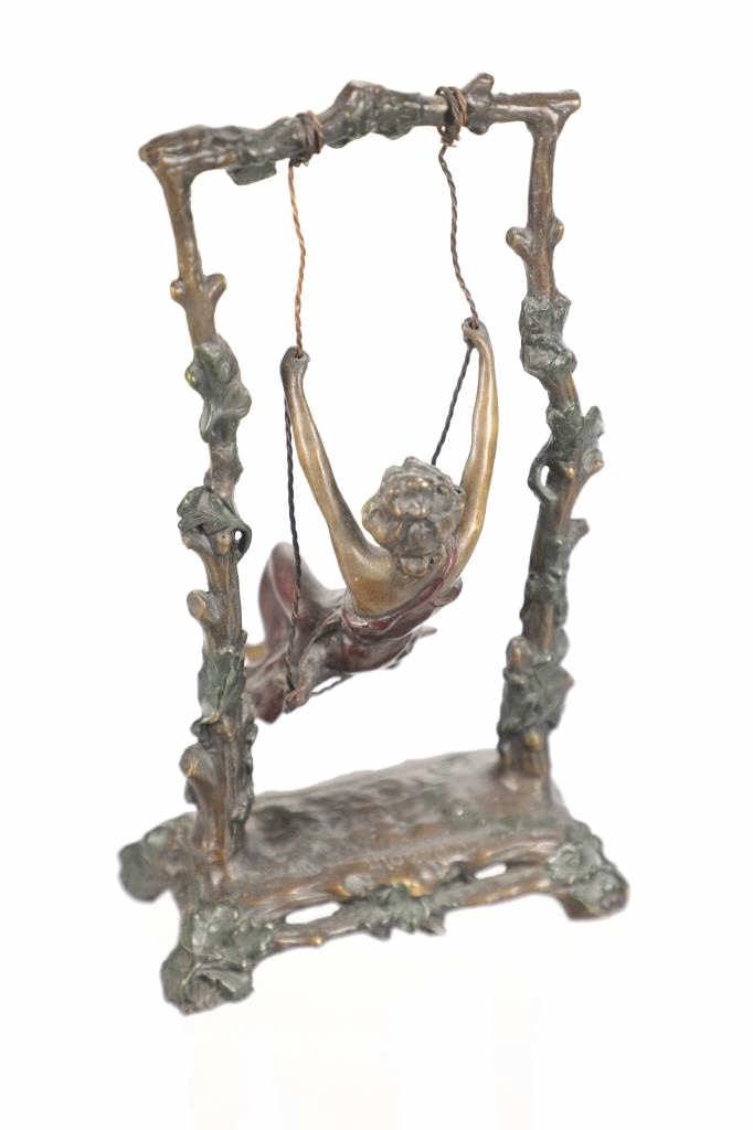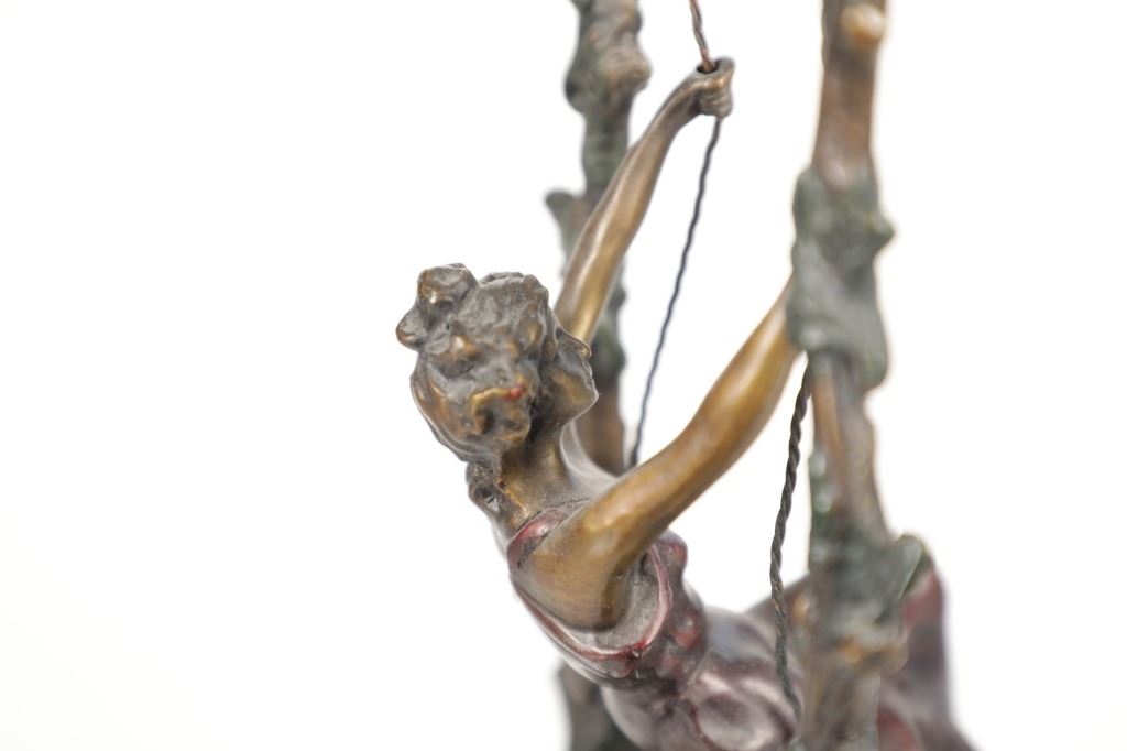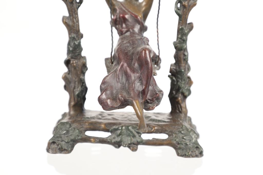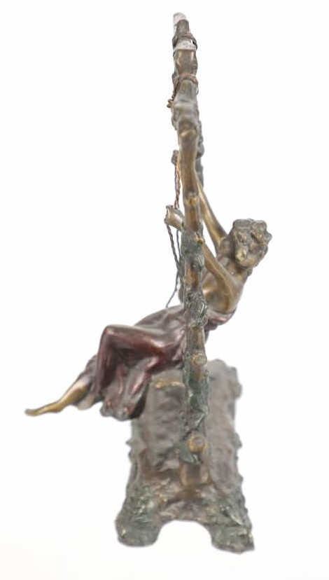 Featured in this lot is a sculpture of a French Mozeau swinging woman, circa mid-1900s. The sculpture shows a wonderfully and professionally crafted bronze construction. The bronze sculpture features a scene of a young woman in a dress on a swing that is free hanging and decorated with a floral design. The bronze is marked as follows: Mozeau - 17/100. The overall condition of this bronze sculpture is good with no obvious signs of damage. The measurements of this bronze sculpture are 10 1/4" x 5 3/4" x 5".*